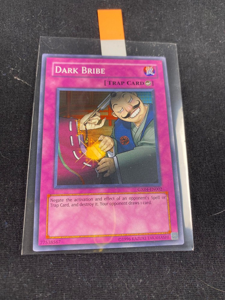 Yu-Gi-Oh! Dark Bribe GX Tag Force 2 GX04-EN002 Super Rare. I am open to offers so feel free to send me a best offer. I am selling a bunch of cards, so have a look at my other listings. I have done my best to get a good picture to show quality and any imperfections. If you require more photos, let me know and I can get some on request.