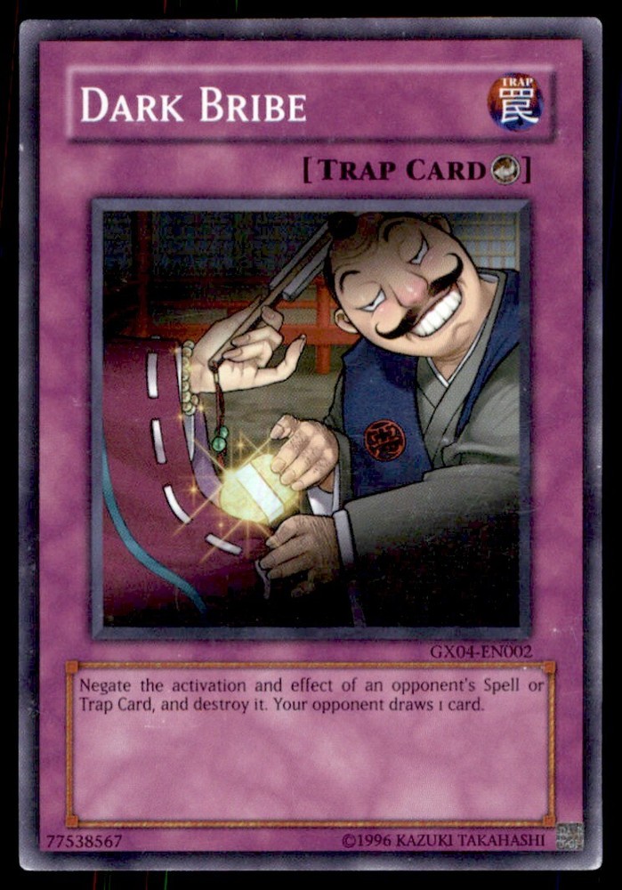 About Me Other Listings Feedback Add to Favorites Contact Me Bluenose Yu-Gi-Oh! Dark Bribe #GX04-EN002 Near Mint No stock photo / These are real scans or pictures Details Description: Dark Bribe Category: Yugioh Year: 1996 Product: Yu-Gi-Oh! Card Number: GX04-EN002 Special: Near Mint Dimensions: 3¼" x 2¼" SKU: YU B0002 R02 I (29) Payment Payment for buy it now is required immediately and for auctions it must be paid within 72 hours. Shipping Shipments usually make their way out in 3 business days. All orders to USA under 800$ USD typically are NOT subject to import or duty! We also offer free shipping on all our cards for north america. Returns and Claims Please view listing photo and description prior to purchase of card to make sure the card and condition is right for you! About Us Please keep in mind the following conditions .-------------------------------------------Near Mint: a card that shows very little to no signs of ware or usage such as very little whiting. -------------------------------------------Light Play: A card that shows signs of ware such as but not limited to whiting, slight bend or scratches. -------------------------------------------Heavy Play: A card that shows signs of ware, whiting, bending, creasing, folding or other various issues.-------------------------------------------Damaged: a card in very bad condition can have some or all of the above mentioned condition notes including peeling, stains, writing, etc.-------------------------------------------The photo in ads are the EXACT card you will recieve. Listing By Kronocard trading cards software v2.7.0.1