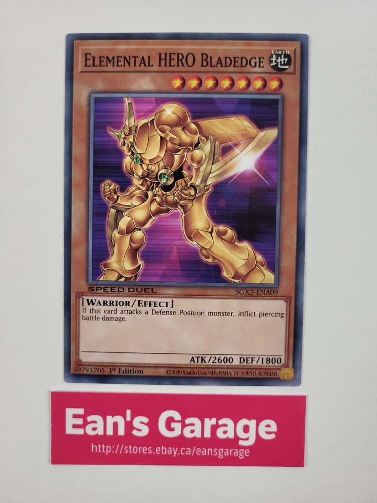 Yu-Gi-Oh! Elemental HERO Bladedge 1st Edition Common Speed Duel GX: Midterm Paradox SGX2-ENA09 Condition: Mint Details (+): Bright and glossy colors, firm and flat, no tearing, no stains, no folds NOTES: All our cards are new and never been played All cards include a rigid Toploader card holder and a clear protective sleeve Please see pictures and read the information below SAVE ON SHIPPING! COMBINED SHIPPING SAVINGS APPLY AUTOMATICALLY WHEN YOU ADD MULTIPLE ITEMS TO YOUR SHOPPING CART PLEASE READ OUR WARRANTY, SHIPPING AND RETURNS POLICIES BELOW · Condition and grading: · We provide our best judgement based on general comic grading standards, we are not professional or certified graders. · FA: (Fair) Lots of problems, stains, big chunks missing, loose pages, split spline, etc. · GD: (Good) some wear and tear, small tears or small pieces missing, heavy roll on spline · VG: (Very Good) little wear and tear, little gloss, some creases and small folds, yellowish pages, some minor damage on spline but pages are all attached · FN: (Fine) very little wear, minor creases or folds, some stress marks on spline · VF: (Very Fine) minor wear, firm and flat spline, minor folds or bends · NM: (Near Mint) looks glossy and new, firm and flat, very minor marks · MN: (Mint) almost perfect condition · Gem Mint: perfect condition.... Warranty Contact us if you have any issues with an order as your first step, we will do our best to resolve any problems in a fast and professional way. We have done our best to describe the items we sell as accurate as possible, again, if you have any questions, please ask before shopping Our games and movies are tested so we guarantee they are in good operational condition, regardless, if any issues arise within 48 hours after receiving your items, please contact us. There is no guarantee for any download codes or it's validity and in many cases we ignore if they would've been part of the original package, therefore: No download codes, skins or manuals are included unless noted otherwise. Shipping We combine shipping Within Canada and the U.S: Canadapost Lettermail or Small Packets USA air are our default - transit time can be up to 15 business days (Monday thru Friday) depending on your location. Transit time and Customs clearing are beyond our control. International shipping options may vary depending on your location and might take up to 4 weeks depending on the shipping service you select and it's availability, again, transit time and Customs Clearing are beyond our control. For faster and traceable services please pick Expedited, Express or Priority. Regular letterpost and most Economy services DO NOT include a tracking number We ship within 48 hours (Monday thru Friday), this means that we take your parcel to the postal office, beyond that point is up to the carrier (Canadapost, FedEx or UPS) Please consider these facts when leaving feedback and rating us since we are not the operators. Orders placed on Friday after 3 pm, Saturday or Sunday will be shipped on Monday. Returns 1.- Contact us 2.- Let us know what is the problem immediately after receiving 3.- Only valid reasons for a return are: wrong item or defective item 4.- Do not unpack or use the item(s) 5.- Item(s) must be returned in exact condition as they were shipped by using a traceable postal service Track Page Views With Auctiva's FREE Counter