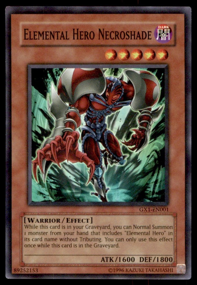 About Me Other Listings Feedback Add to Favorites Contact Me Bluenose Yu-Gi-Oh! Elemental Hero Necroshade #GX1-EN001 Light Play No stock photo / These are real scans or pictures Details Description: Elemental Hero Necroshade Category: Yugioh Year: 1996 Product: Yu-Gi-Oh! Card Number: GX1-EN001 Special: Light Play Dimensions: 3¼" x 2¼" SKU: YU B0005 R01 F (6) Payment Payment for buy it now is required immediately and for auctions it must be paid within 72 hours. Shipping Shipments usually make their way out in 1-2 business days. Returns and Claims Please view listing photo and description prior to purchase of card to make sure the card and condition is right for you! About Us Please keep in mind the following conditions .-------------------------------------------Near Mint: a card that shows very little to no signs of ware or usage such as very little whiting. -------------------------------------------Light Play: A card that shows signs of ware such as but not limited to whiting, slight bend or scratches. -------------------------------------------Heavy Play: A card that shows signs of ware, whiting, bending, creasing, folding or other various issues.-------------------------------------------Damaged: a card in very bad condition can have some or all of the above mentioned condition notes including peeling, stains, writing, etc.-------------------------------------------The photo in ads are the EXACT card you will recieve. Listing By Kronocard trading cards software v2.8.2.3