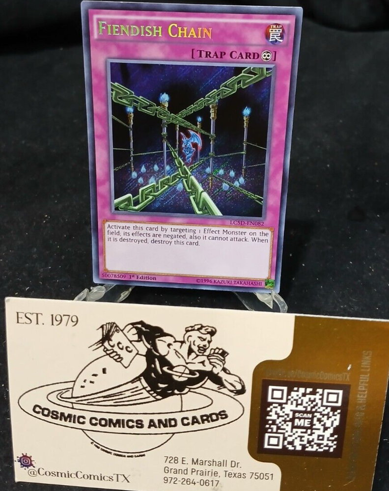 Yu-Gi-Oh! Fiendish Chain LC5D-EN082 Secret Rare LP Very good condition, slight wear but well maintained. See Photo for more details. Check out the rest of our Listings! GREAT ITEM FOR YOUR COLLECTION Free Shipping. thank you any questions ... please feel free to ask and we will respond as soon as possible.