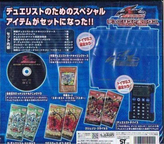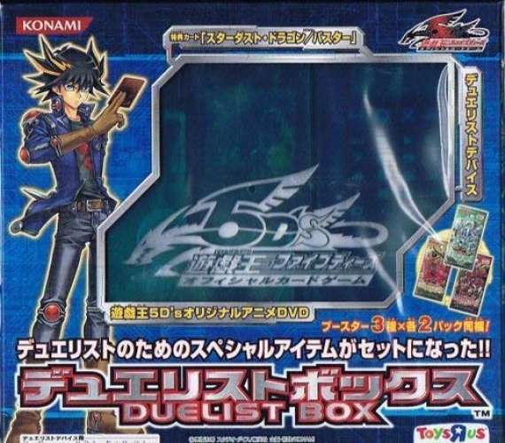 Yu-Gi-Oh Five Dees Official Card Game DUELIST BOX from japan Description Toys R Us Limited Color Special Duelist Card Carrying Case x 1 Toys R Us Limited Color Special Duelist Device x 1 (2 AA Alkaline Batteries Specifications: Sold Separately) Yu-Gi-Oh 5D's original anime DVD x 1 Yu-Gi-Oh! 5D's OCG PACK x 6 packs Special card "Stardust Dragon / Buster" x 1 Payment We only accept PayPal payments. Please pay within 3 days after auction is finished. shipping Shipping Cost Shipping Method Asia, Middle East America,Canada Australia,Mexico Europe Russia Other Shipping Duration Shipping Method Asia, Middle East America,Canada Australia,Mexico Europe Russia Other ePacket 3 - 7 days 5 - 12 days 4 - 8 days 6 - 8 days We will ship your item within 3-5 business days, after your payment. We can ship ONLY to your Paypal address. Term of Sale We can accept return within 30 days after you receive it. Please make sure to contact us first if you want to return it. It is buyer's responsibility for the return shipping cost when sending back the item to us. The item has to be returned in the original condition from the time you received. No returns on products that show any evidences of use. About Us A specialty shop offering a wide variety of carefully selected Japanese brand items. Unless marked "used" all of our inventory is brand new, so you can feel confident about your purchase. Even if you think to yourself, "But the item I want is only available in Japan.", make sure to consult with us before giving up hope. We will look for and suggest the best products on your behalf. International Buyers - Please Note: Import duties, taxes and charges are not included in the item price or shipping charges. These charges are the buyer''s responsibility. Please check with your country''s customs office to determine what these additional costs will be prior to bidding/buying. These charges are normally collected by the delivering freight (shipping) company or when you pick the item up - do not confuse them for additional shipping charges.
