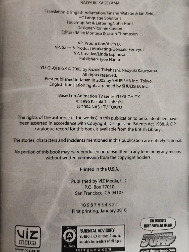 Book has some yellowing and ships that day or next and if you have any questions or concerns please feel free to contact me. Immerse yourself in the world of Yu-Gi-Oh! GX with this captivating graphic novel. The second volume of the series features an impressive lineup of artists and writers including John Hunt, Ian Reid, Naoyuki Kageyama, and Hc Language Solutions. The story follows the adventures of your favorite characters in a US Comics tradition. The cover art by Naoyuki Kageyama is simply mesmerizing. This trade paperback is in English language and was published by Viz in 2010. The book does not include a card. This is a must-read for fans of adventure and fantasy genres. Get your hands on this modern age comic masterpiece now!