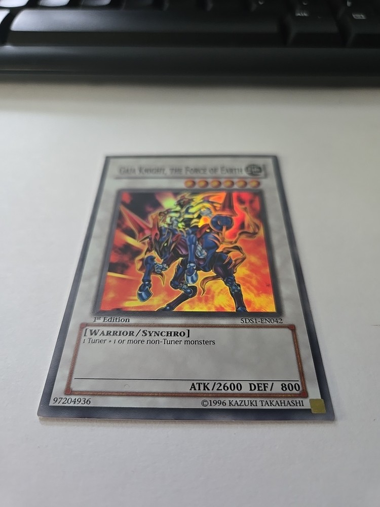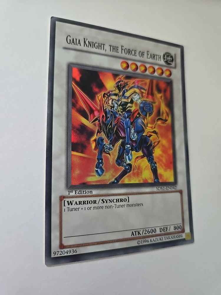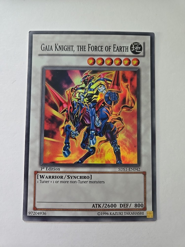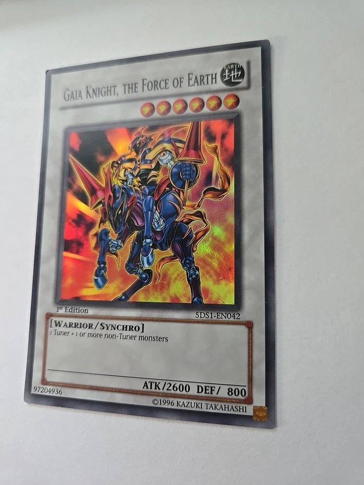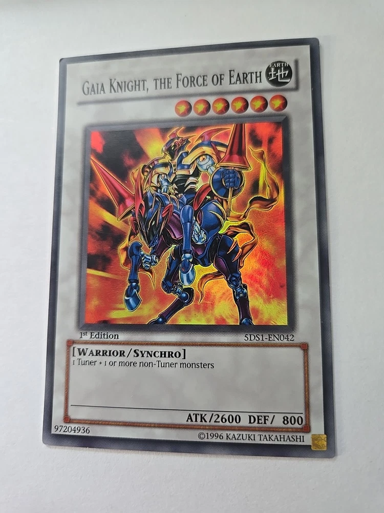 Elevate your Yu-Gi-Oh! TCG collection with the majestic Gaia Knight, the Force of Earth, a Super Rare 1st Edition card that brings a touch of strategic advantage to any deck. This synchro monster, with its awe-inspiring 800 defense and 2600 attack, is a Basic Stage creature that can turn the tide of battle. Featuring the iconic Synchro creature type and the sought-after 1st Edition foil finish, it's a standout addition to any collector's array. Item# 39 Binder