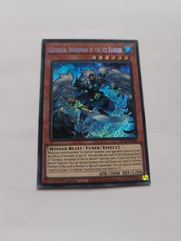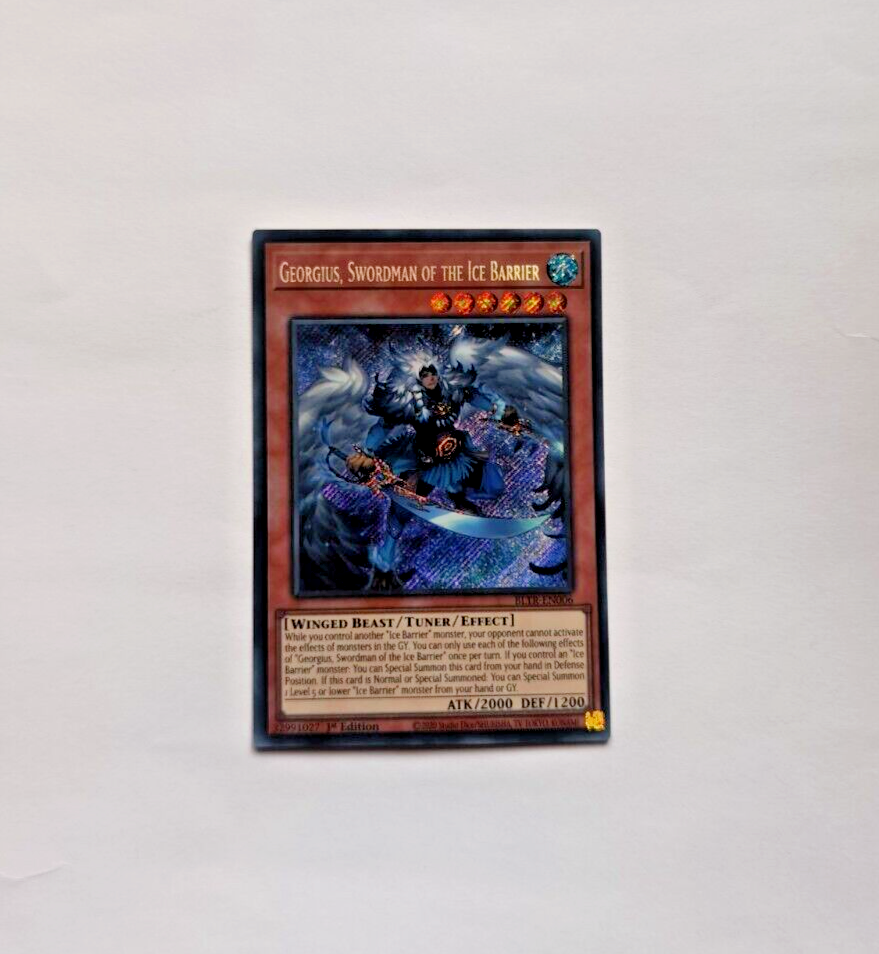 YuGiOh Georgius Swordsman of the Ice Barrier Secret Rare 1st Edition BLTR from a freshly opened pack. Handled with care...