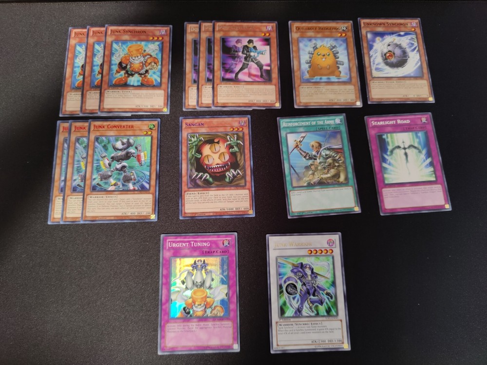 All cards are lightly played to near mint Monsters Junk Synchron - 5DS3-EN010 - Common x3 Doppelwarrior - STOR-EN002 - Rare x3 Junk Converter - LDS3-EN118 - Ultra Rare x3 Sangan - LDS3-EN001 - Ultra Rare x1 Quillbolt Hedgehog - TDGS-EN003 - Common x1 Unknown Synchron - SDSE-EN008 - Common x1 Spells Reinforcement of the Army - SDSE-EN028 - Common x1 Traps Starlight Road - DP10-EN025 - Rare x1 Urgent Tuning - CSOC-EN065 - Super Rare x1 Extra Deck Junk Warrior - 5DS1-EN041 - Ultra Rare x1