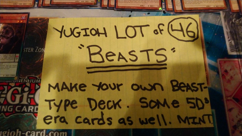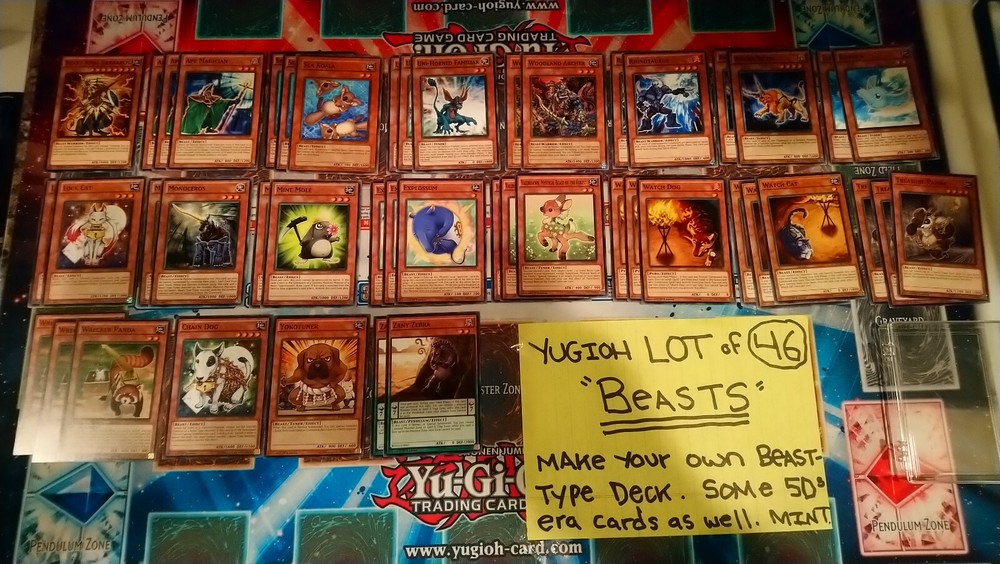 This is the PERFECT way to start a themed deck, or add cards to an existing deck without paying high prices for old school packs or singles. SOME OF THEM ARE 5Ds ERA Too! This auction is for a 46-CARD LOT of themed Yu-Gi-Oh cards ( everything in the picture, and whatever else I describe below). MINT, Unplayed. COMMONS! SOME XYZs! 50% 1st Edition, 50% Unlimited...ALL NEW, ALL MINT --- 2008 thru 2018 (mixed)! Including Raging Tempest, YuGiOh 5Ds, Duelist Revolution, Battle Pack, and Stardust Overdrive among others! Auction : BEAST-Type Monster Lot, total of 46 in all! Comes with Beast and Beast-Warrior Cards of the SAME series or SAME Archetype. They WORK IN CONJUNCTION with each other! Compatible Effect Monsters too! Make your OWN affordable "BEAST/ANIMAL" deck from scratch, with these HELPFUL commons, 46 in all! See pictures, see list below. Comes in protective case. NAME OF MINI-LOT (46 cards - Assorted): BEASTS x 46 NAME OF CARDS (comes delivered in protective case): 1x BEAST KING BARBAROS ---- commons 3x APE MAGICIAN ---- commons 3x SEA KOALA ---- commons 3x UNI-HORNED FAMILIAR ---- commons 2x WOODLAND ARCHER ---- commons 2x RHINOTAURUS ---- commons 2x BICORN RE'EM ---- commons 2x ELEPHUN ---- commons 2x LOCK CAT ---- commons 2x MONOCEROS ---- commons 2x MINE MOLE ---- commons 3x EXPLOSSUM ---- commons 3x VALERIFAWN MYSTICAL BEAST OF THE FOREST ---- commons 3x WATCH DOG ---- commons 3x WATCH CAT ---- commons 3x TREASURE PANDA ---- commons 3x WRECKER PANDA ---- commons 1x CHAIN DOG ---- commons 1x YOKOTUNER ---- commons - (tuner) 2x ZANY ZEBRA ---- commons - (pendulums) A little bit of everything, the essentials to boot. Plus, OUT OF PRINT 5Ds cards. Make your own BEAST-TYPE deck for LESS than 14 dollars! Honestly, best deal on Ebay! 46 cards in all, Mint LOT, 50% 1st Edition and 50% Unlimited, Commons...BEAST-DECK READY! I accept Paypal ONLY , United States ONLY ( otherwise, EBAY GLOBAL SHIPPING PROGRAM ). Cards will be shipped in insulated packaging (like sturdy Bubble Mailer), tracking number within 72 hours, everything is inspected and checked beforehand, and I ship with care . I combine shipping too, so check out my other MINI-LOTS. Good luck.