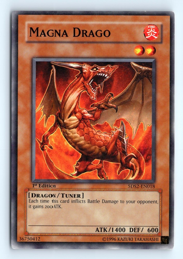 Cards 20$ or Less in Price Will be shipped in a penny sleeve and in a top loader or Semi Rigid card holder by Ebay standard envelope. Please check out the scans for a good look at the condition. This is a example of a 5D's Starter Deck 2009 #5DS2-EN018 Magna Drago . Please check out our other listings for more great cards.