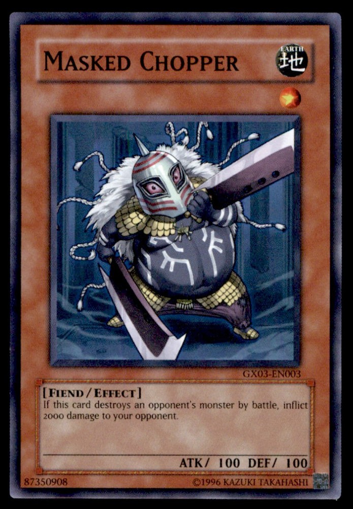 About Me Other Listings Feedback Add to Favorites Contact Me Bluenose Yu-Gi-Oh! Masked Chopper #GX03-EN003 Near Mint No stock photo / These are real scans or pictures Details Description: Masked Chopper Category: Yugioh Year: 1996 Product: Yu-Gi-Oh! Card Number: GX03-EN003 Special: Near Mint Dimensions: 3¼" x 2¼" SKU: YU B0004 R02 O (31) Payment Payment for buy it now is required immediately and for auctions it must be paid within 72 hours. Shipping Shipments usually make their way out in 1-2 business days. Returns and Claims Please view listing photo and description prior to purchase of card to make sure the card and condition is right for you! About Us Please keep in mind the following conditions .-------------------------------------------Near Mint: a card that shows very little to no signs of ware or usage such as very little whiting. -------------------------------------------Light Play: A card that shows signs of ware such as but not limited to whiting, slight bend or scratches. -------------------------------------------Heavy Play: A card that shows signs of ware, whiting, bending, creasing, folding or other various issues.-------------------------------------------Damaged: a card in very bad condition can have some or all of the above mentioned condition notes including peeling, stains, writing, etc.-------------------------------------------The photo in ads are the EXACT card you will recieve. Listing By Kronocard trading cards software v2.8.2.3