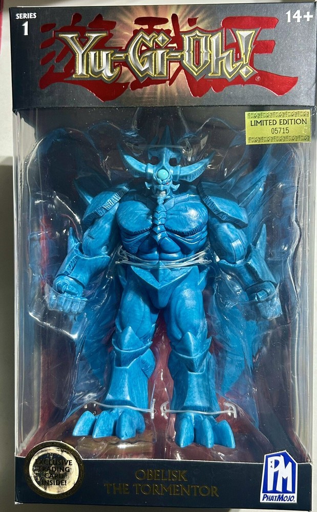 Yu-Gi-Oh! OBELISK THE TORMENTOR PhatMojo Series 1 7” Action Figure is a limited edition collectible featuring the character Obelisk The Tormentor from the Yu-Gi-Oh! TV show and movie. It includes an exclusive trading card and stands 7 inches tall. This blue plastic action figure is part of the Yu-Gi-Oh! franchise and is a 1:10 scale model manufactured in China. Ideal for ages 14 and up. Item is new and has been displayed for short time. This item will come with the card inside and has not been open. It may come with freebies if the box permits. Freebies may be but not limited to Yu-Gi-Oh cards, toy cars, stickers , and more