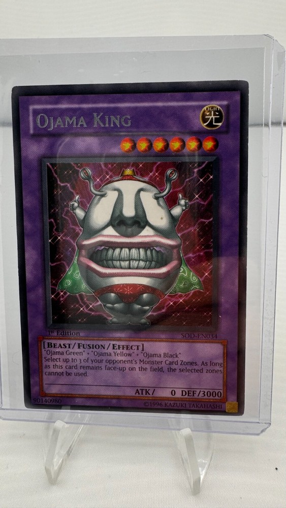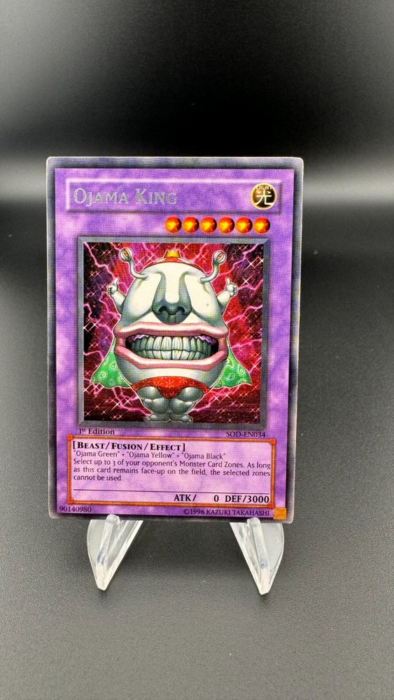 This Yu-Gi-Oh! card is a must-have for serious collectors—Ultimate Rare 1st Edition Near Mint condition makes it a standout. The Ojama King’s unique fusion design and 3000 defense add serious value, especially with its GX-era Soul of the Duelist origins. Konami’s 1996 craftsmanship shines in this English-language gem, perfect for fans of vintage, high-rarity cards. A true treasure for any duelist’s collection!