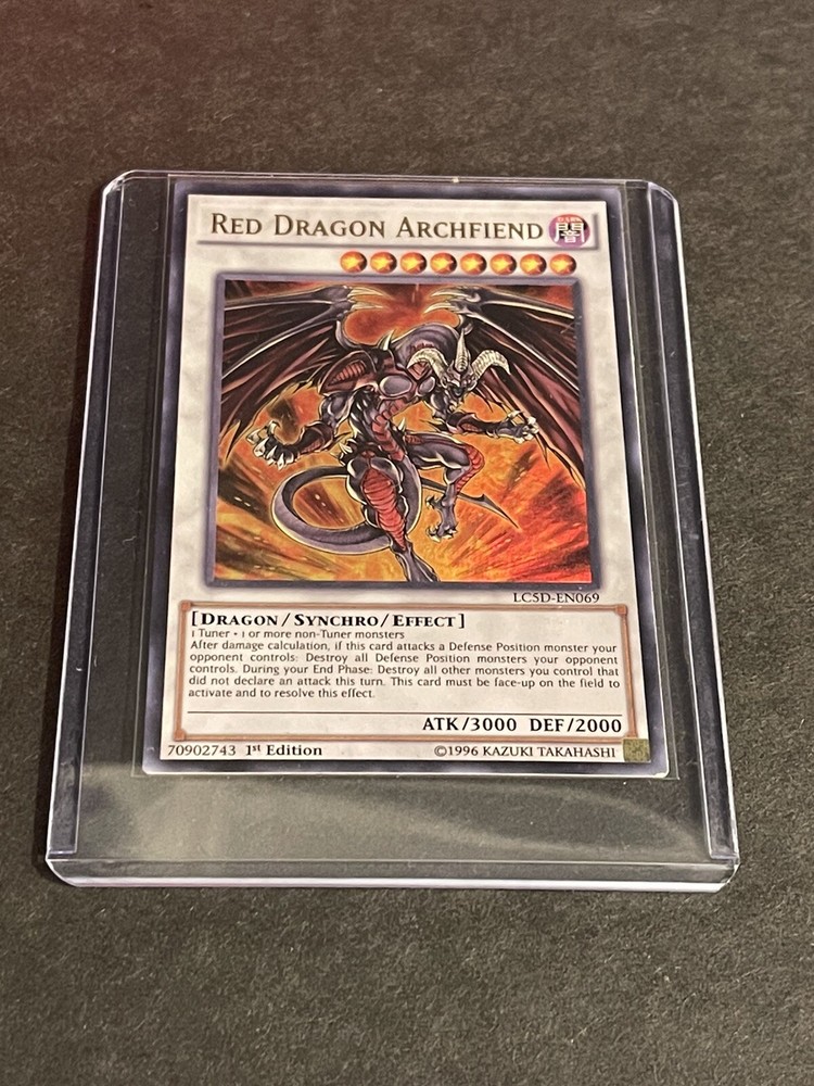This Yu-Gi-Oh! card is a highly sought-after Red Dragon Archfiend from the Legendary Collection 5D's set. It features a dark color scheme and is an ultra-rare holographic 1st edition card with a foil finish. The card is a synchro type and is manufactured by Konami. It's a must-have for any collector of Yu-Gi-Oh! TCG cards, especially for those interested in dragons and monsters. The card name is prominently displayed and the rarity and features of the card are noted in the description. Add this Red Dragon Archfiend to your collection today! Shipped in soft sleeve and top loader.