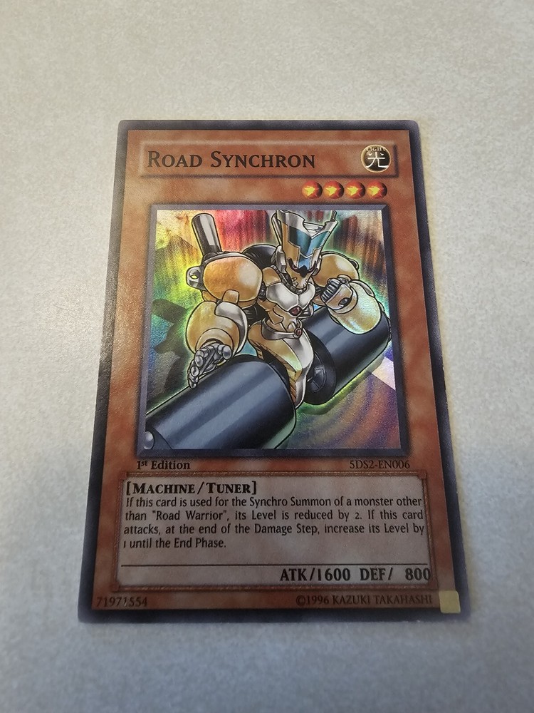 Experience the thrill of Yu-Gi-Oh! with this amazing Road Synchron card. This Super Rare 1st Edition card is a must-have for any collector or player. Its holographic finish and Japanese card size make it a unique addition to your collection. With a powerful attack of 1600 and a defense of 800, this Machine creature card is made of high-quality card stock and features the iconic Yu-Gi-Oh! logo. The card is in English and has been manufactured by Konami in the United States. Don't miss out on the opportunity to add this rare card to your collection.