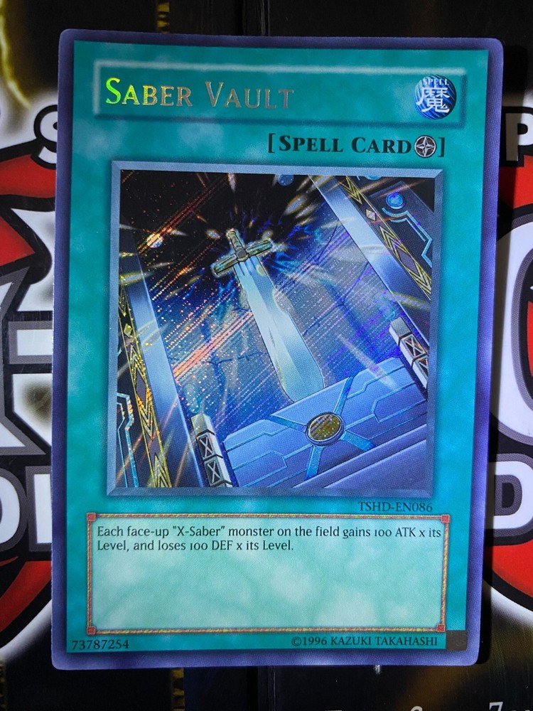 YuGiOh Saber Vault TSHD-EN086 LP. Please review photos before purchase. Additional photos may be requested if interested.