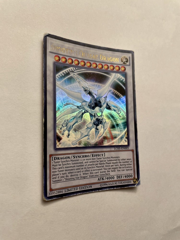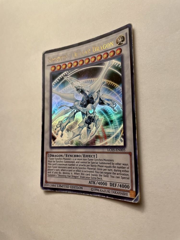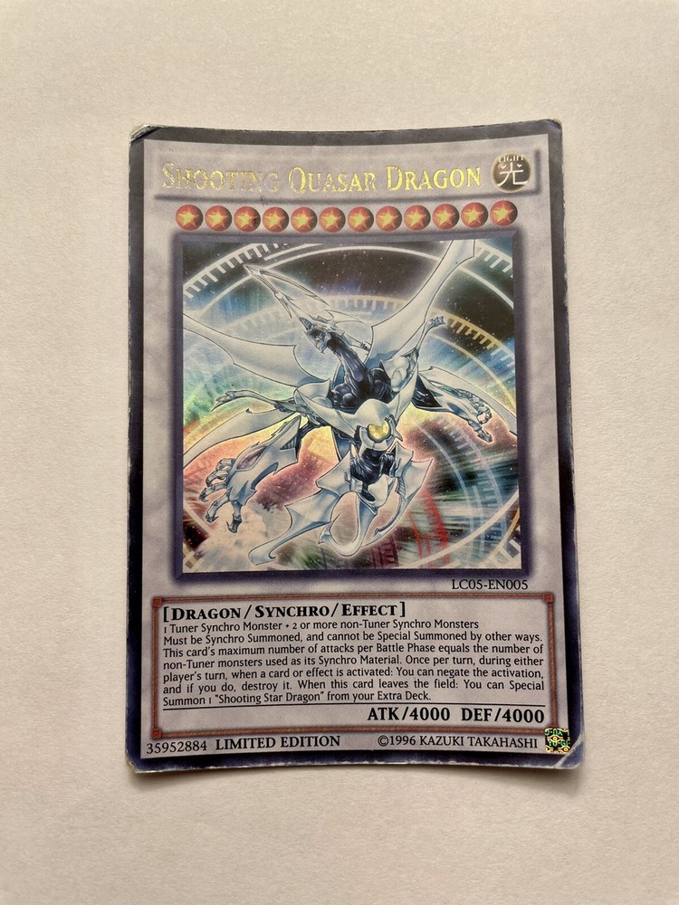 YuGiOh! Shooting Quasar Dragon - LC05-EN005 - Ultra Rare - Limited Edition. Please look at account profile as I have other card(s) that I’m selling and could save you money! The card(s) will be shipped in a first class package, not envelope. The card(s) will be shipped inside large sleeve, inside a "toploader" hard case. Extremely safe from moisture or bending. The card(s) may have heavy issues or may have slight whitening around the edges or small mark on the card. Could have some creases but no burns. Please look at all pictures for this will be the card(s) you purchase. Overall condition of card(s) 8/10! Heavy played to Near mint condition please reference photos. SHIPPING AND RETURNS: I have 1 Day to 3 Day Handling, either because of Sunday (no usps running) or because of COVID reasons, your order will be shipped asap. Once shipped, it will usually take 3-4 business days to arrive at your door, sometimes less! Please advises that there will be NO Returns / Refunds on items as you understand your buying the item in the picture as is.