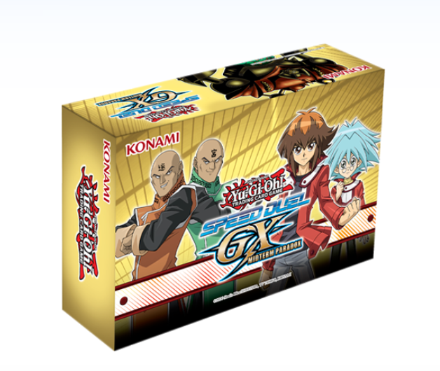 Yu-Gi-Oh! Speed Duel GX Duel Midterm Paradox In the Yu-Gi-Oh! GX animated series, Dr. Crowler hired the Paradox Brothers to teach Jaden Yuki and Syrus Truesdale a lesson! Now you can step into the shoes of the Slifer Red students – or their opponents – in Speed Duel GX: Midterm Paradox Mini Box! Speed Duel GX: Midterm Paradox Mini Box expands on the Speed Duel GX: Duel Academy Box introducing even more cards from the Yu-Gi-Oh! GX animated series that are new to Speed Duel! Speed Duel GX: Midterm Paradox contains 4 complete Speed Duel Decks with over 100 cards ready-to-play out of the box! Here is just some of what you can expect. Pre-built Decks for Jaden Yuki, Syrus Truesdale, Bastion Misawa, and the Paradox Brothers! Brand-new Skill Cards for iconic Yu-Gi-Oh! GX characters! Explore new strategies with additional cards and upgrade the Speed Duel Decks you already own! Discover Secret Rare variants of popular GX-era cards! Play with it on its own, or as a perfect complement to the Speed Duel GX: Duel Academy Box Each Speed Duel GX: Midterm Paradox Mini Box contains: 100 Common Cards 4 (of 12) Secret Rare Cards 12 Skill Cards 2 Two-Player Jaden Yuki & Syrus Truesdale Deluxe Game Mat To use a card in Speed Duel it must have the Speed Duel Symbol on the card, cards without the Symbol are not legal, but Speed Duel cards can be used in the Yu-Gi-Oh! TCG. Skill Cards may only be used in Speed Duel.