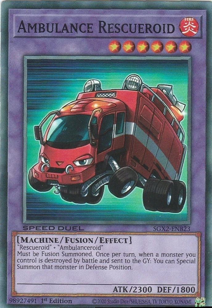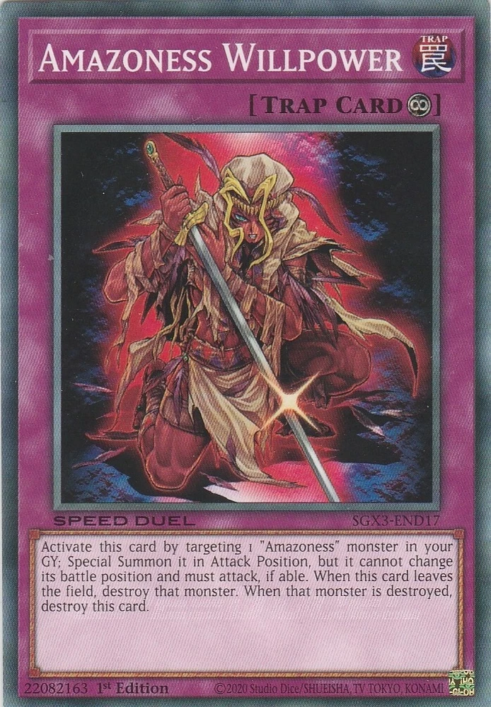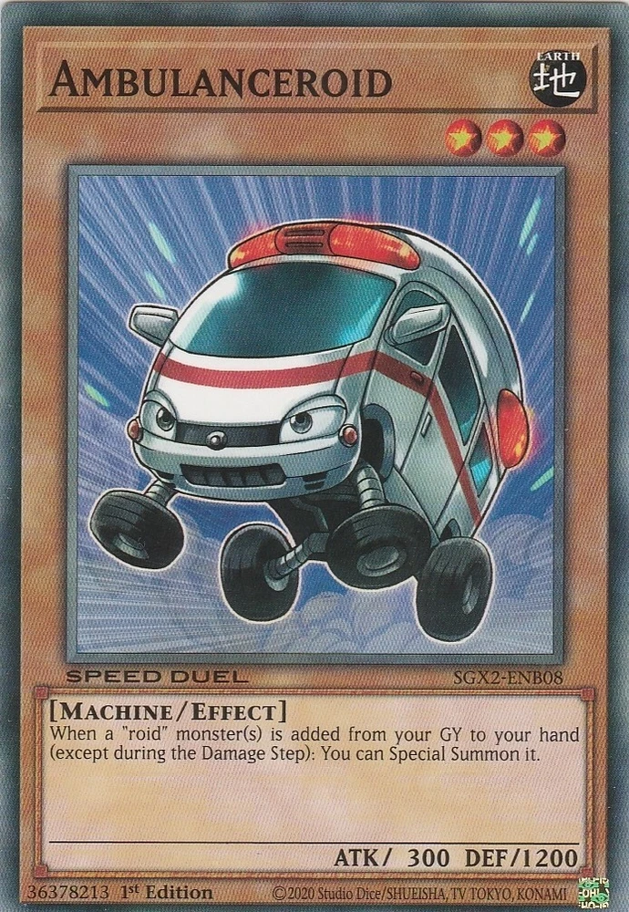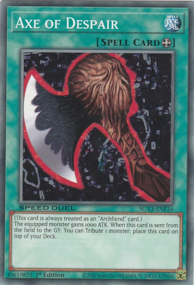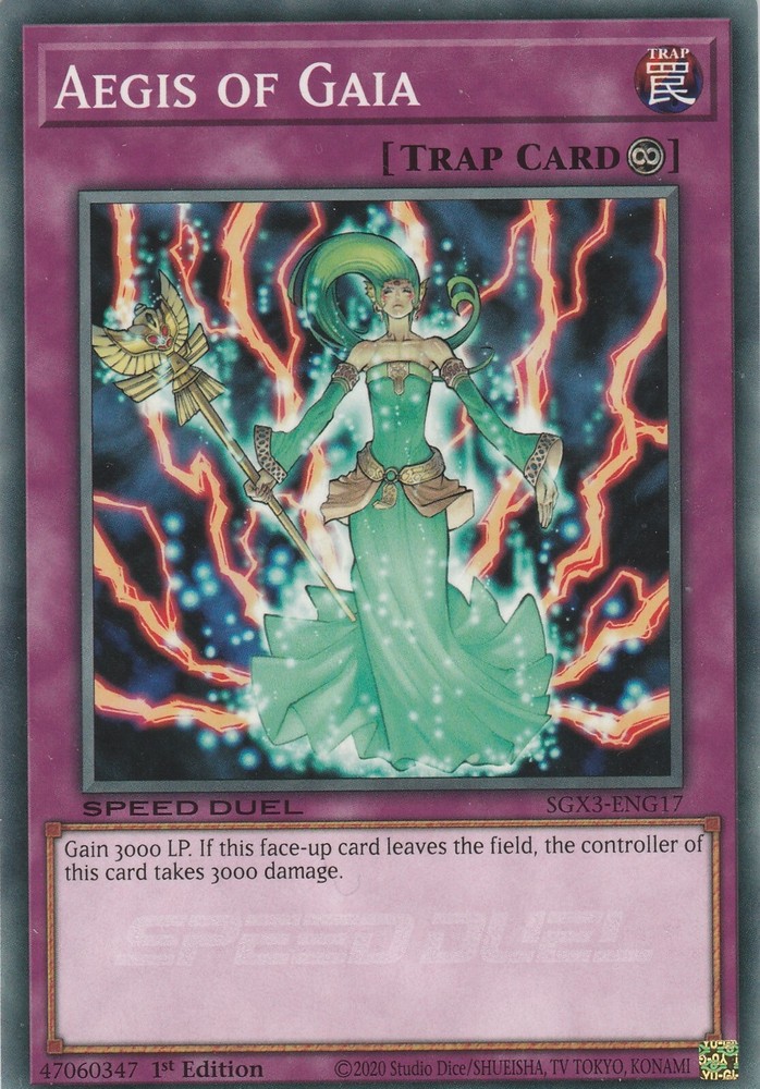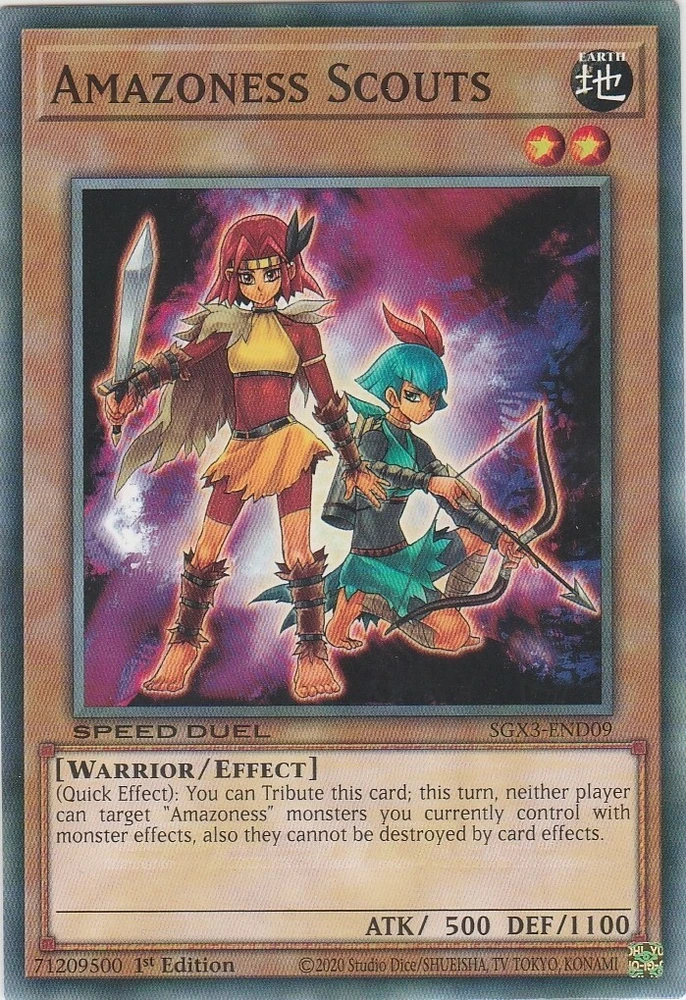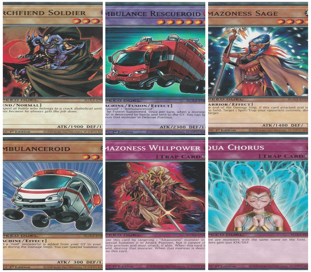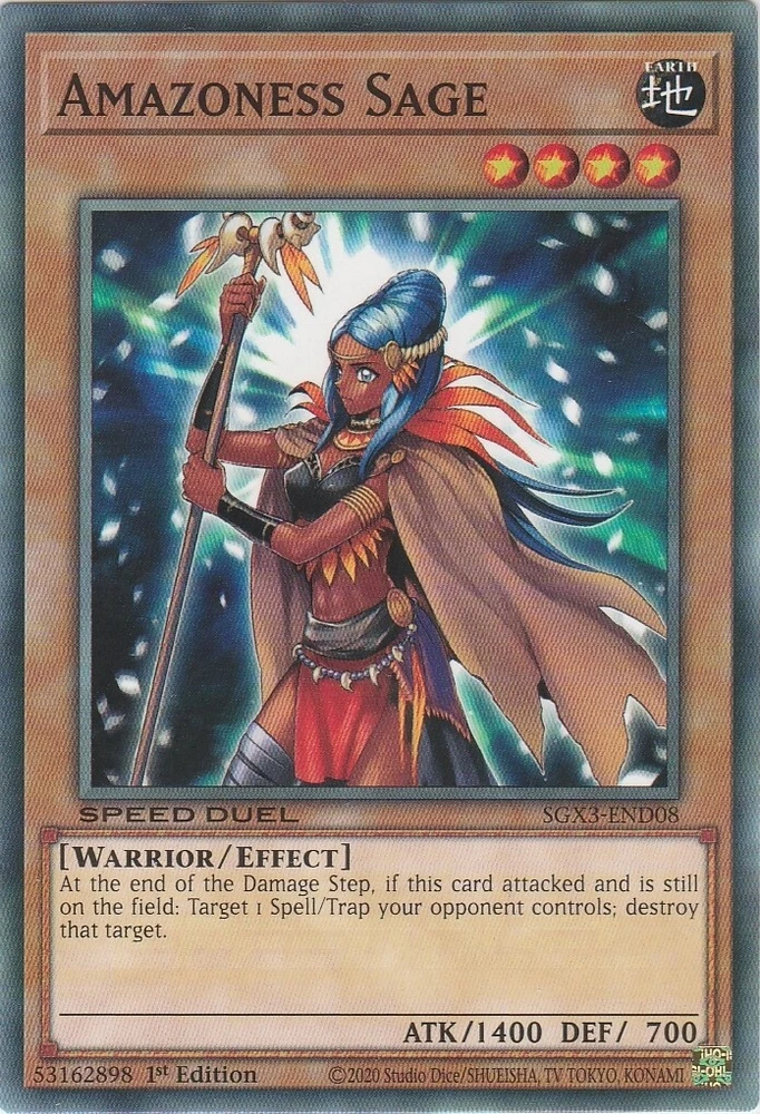 Yu-Gi-Oh!-Speed Duel GX-Cards Starting with letter A-Near Mint or Better Condition Yugioh Speed Duel- Aegis of Gaia - SGX3-ENG17 -Near mint or Better Condition Gain 3000 Life Points. If this face-up card is removed from the field, take 3000 damage. Yu-Gi-Oh! Speed Duel GX: Amazoness Archers - SGX3-END16 Near mint or Better. When an opponent's monster declares an attack , while you control an " Amazoness " monster: Change all monsters your opponent currently controls to face-up Attack Position ( Flip Effects are not activated), they lose 500 ATK , also they must attack this turn , if able. Yugioh Speed Duel GX-Aqua Chorus-SGX3-ENI34 -Near Mint or Better If there are monsters with the same name on the field, increase the ATK and DEF of all those monsters with the same name by 500 points. Yugioh Speed Duel GX-Archfiend Soldier-SGX3-ENE02-Near mint or Better Condition An expert at battle who belongs to a crack diabolical unit. He's famous because he always gets the job done. Yugioh Speed Duel GX-Axe of Despair-SGX3-ENE16-Near Mint or Better (This card is always treated as an "Archfiend" card.) The equipped monster gains 1000 ATK. When this card is sent from the field to the Graveyard: You can Tribute 1 monster; place this card on the top of your Deck. Yu-Gi-Oh! Speed Duel GX : Ambulance Rescueroid SGX2-ENB23- Near Mint or Better. "Rescueroid" + "Ambulanceroid" Must be Fusion Summoned. Once per turn, when a monster you control is destroyed by battle and sent to the GY: You can Special Summon that monster in Defense Position. Yu-Gi-Oh! Speed Duel GX : Ambulanceroid SGX2-ENB08 Near Mint or Better. When a "roid" monster(s) is added from your GY to your hand (except during the Damage Step): You can Special Summon it. Yu-Gi-Oh! Speed Duel GX: Amazoness Sage SGX3-ENDO8 Near Mint or Better At the end of the Damage Step, if this card attacked and is still on the field: Target 1 Spell/Trap your opponent controls; destroy that target. Yu-Gi-Oh! Speed Duel GX: Amazoness Scouts SGX3-END09- Near Mint or Better. During either player's turn: You can Tribute this card; this turn, face-up "Amazoness" monsters you currently control cannot be targeted by monster effects, and cannot be destroyed by card effects. Yu-Gi-Oh! Speed Duel GX: Amazoness Willpower SGX3-END17 Near mint or Better. Select 1 " Amazoness " monster in your Graveyard and Special Summon it in Attack Position . It cannot change its battle position and must attack if able. When this card is removed from the field , destroy that monster. When that monster is destroyed, destroy this card.