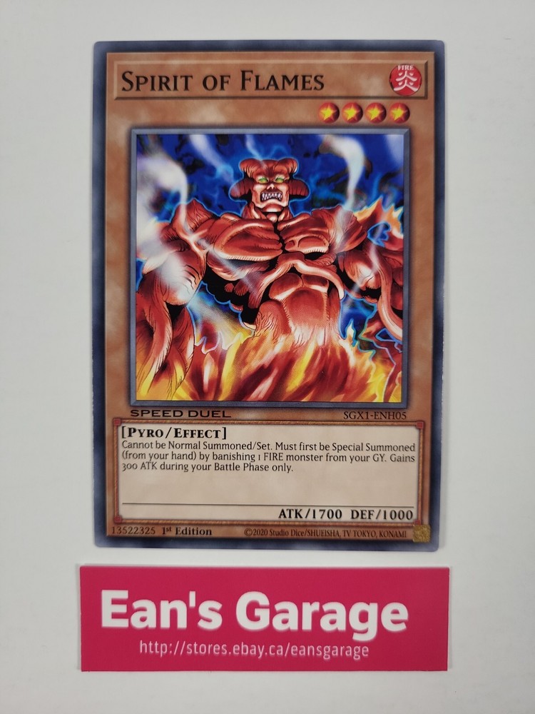 Yu-Gi-Oh! Spirit of Flames common Speed Duel GX: Duel Academy SGX1:ENH05 Condition: Mint Details (+): Bright and glossy colors, firm and flat, no tearing, no stains, no folds NOTES: All our cards are new and never been played All cards include a rigid Toploader card holder and a clear protective sleeve Please see pictures and read the information below SAVE ON SHIPPING! COMBINED SHIPPING SAVINGS APPLY AUTOMATICALLY WHEN YOU ADD MULTIPLE ITEMS TO YOUR SHOPPING CART PLEASE READ OUR WARRANTY, SHIPPING AND RETURNS POLICIES BELOW · Condition and grading: · We provide our best judgement based on general comic grading standards, we are not professional or certified graders. · FA: (Fair) Lots of problems, stains, big chunks missing, loose pages, split spline, etc. · GD: (Good) some wear and tear, small tears or small pieces missing, heavy roll on spline · VG: (Very Good) little wear and tear, little gloss, some creases and small folds, yellowish pages, some minor damage on spline but pages are all attached · FN: (Fine) very little wear, minor creases or folds, some stress marks on spline · VF: (Very Fine) minor wear, firm and flat spline, minor folds or bends · NM: (Near Mint) looks glossy and new, firm and flat, very minor marks · MN: (Mint) almost perfect condition · Gem Mint: perfect condition.... Warranty Contact us if you have any issues with an order as your first step, we will do our best to resolve any problems in a fast and professional way. We have done our best to describe the items we sell as accurate as possible, again, if you have any questions, please ask before shopping Our games and movies are tested so we guarantee they are in good operational condition, regardless, if any issues arise within 48 hours after receiving your items, please contact us. There is no guarantee for any download codes or it's validity and in many cases we ignore if they would've been part of the original package, therefore: No download codes, skins or manuals are included unless noted otherwise. Shipping We combine shipping Within Canada and the U.S: Canadapost Lettermail or Small Packets USA air are our default - transit time can be up to 15 business days (Monday thru Friday) depending on your location. Transit time and Customs clearing are beyond our control. International shipping options may vary depending on your location and might take up to 4 weeks depending on the shipping service you select and it's availability, again, transit time and Customs Clearing are beyond our control. For faster and traceable services please pick Expedited, Express or Priority. Regular letterpost and most Economy services DO NOT include a tracking number We ship within 48 hours (Monday thru Friday), this means that we take your parcel to the postal office, beyond that point is up to the carrier (Canadapost, FedEx or UPS) Please consider these facts when leaving feedback and rating us since we are not the operators. Orders placed on Friday after 3 pm, Saturday or Sunday will be shipped on Monday. Returns 1.- Contact us 2.- Let us know what is the problem immediately after receiving 3.- Only valid reasons for a return are: wrong item or defective item 4.- Do not unpack or use the item(s) 5.- Item(s) must be returned in exact condition as they were shipped by using a traceable postal service Track Page Views With Auctiva's FREE Counter