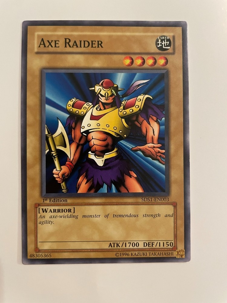Yu-Gi-Oh! TCG Axe Raider Yu-Gi-Oh! 5D's 5DS1-EN003 1st Edition Common Description About This Items This Yu-Gi-Oh! TCG card features Axe Raider, a warrior creature with 1700 attack and 1150 defense/toughness. It is a common card from the 1996 set Yu-Gi-Oh! 5D's and has a card number of 5DS1-EN003. The card is in English language and manufactured by Konami. It is a normal card with a 1st edition feature. This collectible card game individual card is perfect for Yu-Gi-Oh! TCG enthusiasts and collectors. The card's rarity and set information are included in the aspects section. Get your hands on this card and add it to your collection today! Condition used Shipping We always send the item with a tracking number. So please place an order without any concern on delivery. You can always track the delivery status. Shipping is only available to the address registered in eBay. If you want us to send another address, please change your address on eBay and then place an order. Shipping is available from Monday to Friday. Weekends are not available because freight (shipping) companies are closed. We do not mark merchandise values below value or mark items as ?gifts? ? Japan, US and International government regulations prohibit such behavior. About Importer's Obligation Import duties, taxes, and charges are not included in the item price or shipping cost. These charges are the buyer's responsibility. Please check with your country's customs office to determine what these additional costs will be prior to bidding or buying. Thank you for your understanding.