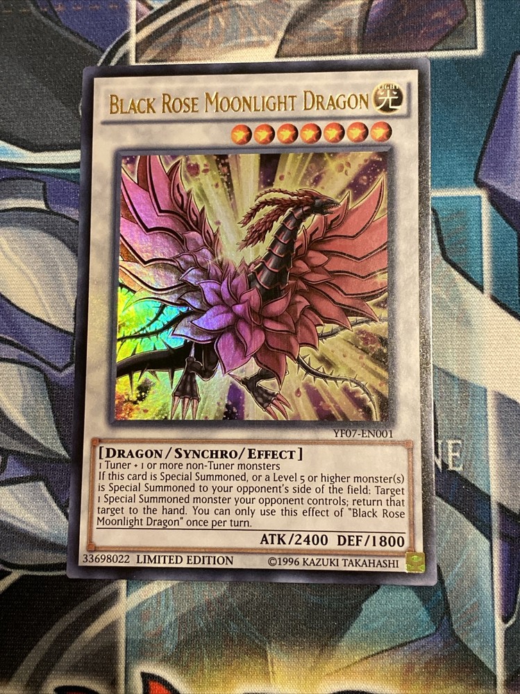 This limited edition Yu-Gi-Oh! TCG card features the Black Rose Moonlight Dragon, with 2400 attack and 1800 defense. It is a synchro card, with the card number YF07-EN001, and belongs to the 5d's Manga Promo set. The card is ultra rare and has the color light, making it a perfect addition to any collector's set. The game is Yu-Gi-Oh! TCG, and it is a creature/monster type dragon card. It is perfect for those who love collectible card games and is an excellent addition to any collection.
