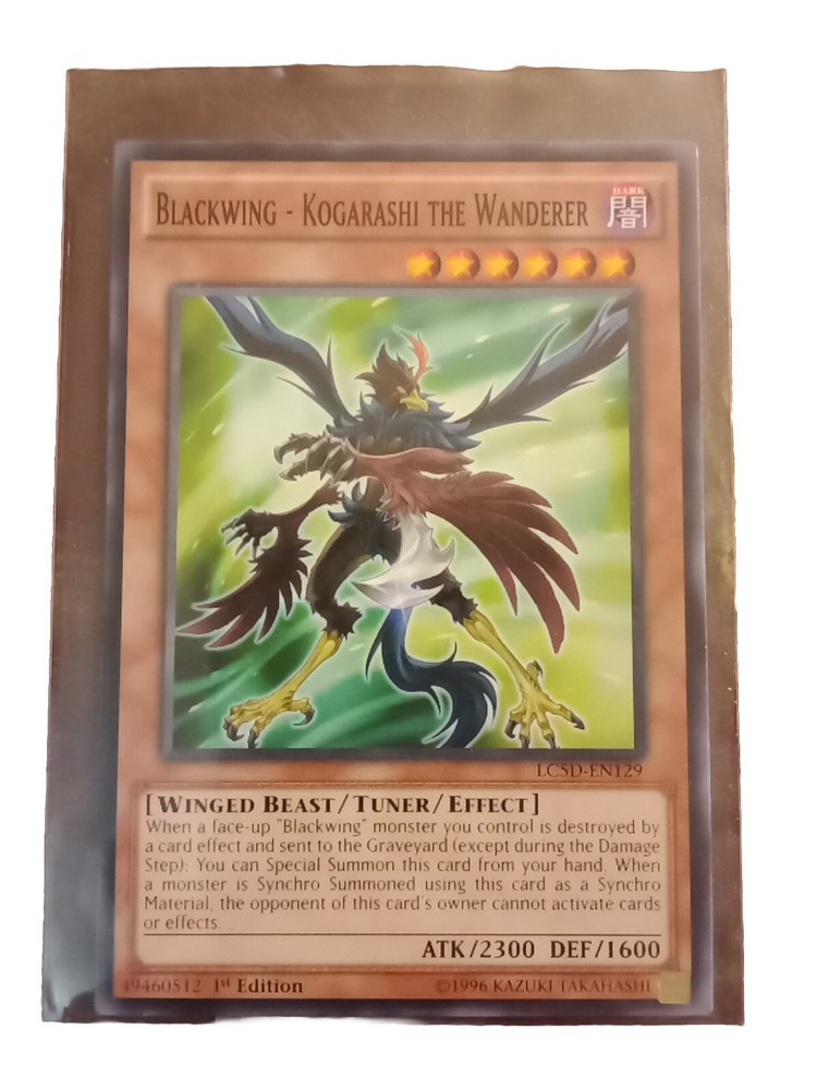 This Yu-Gi-Oh! TCG card features the legendary Blackwing - Kogarashi the Wanderer. The card is part of the Legendary Collection 5D's set and was manufactured by Konami in 1996. It is a common/short print card with a regular finish and a card number of LC5D-EN129. The card is made of card stock material and has 1600 defense/toughness and 2300 attack/power. It is a must-have for any vintage Yu-Gi-Oh! TCG collector and is in English language.