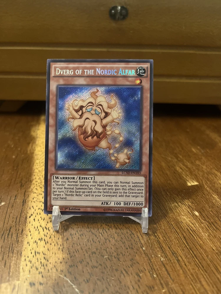 This Yu-Gi-Oh! TCG card is a sought-after Secret Rare 1st Edition Dverg of the Nordic Alfar. It features a Warrior creature type with Earth attribute, Attack/Power of 100, and Defense/Toughness of 1000. This card is from the Legendary Collection 5D's set and manufactured by Konami. Aside from its impressive attributes, this Dverg of the Nordic Alfar card is known for its unique Effect card type. It is a great addition to any collector's CCG individual cards, especially those who are fans of the Yu-Gi-Oh! TCG game. Get this rare card and add it to your collection now!