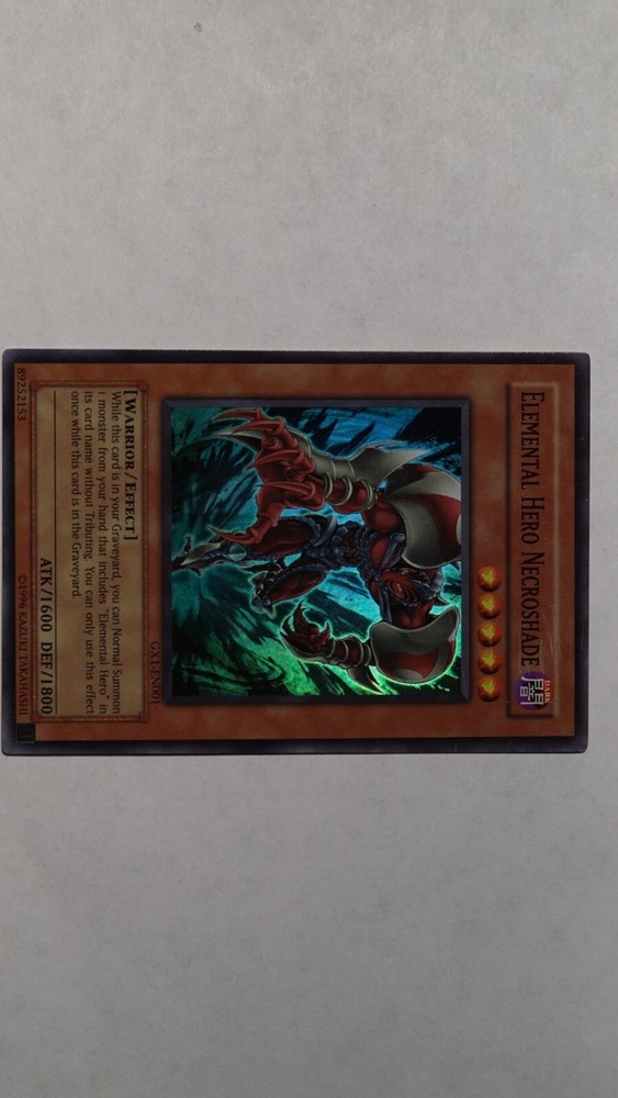 This limited-edition Elemental Hero Necroshade is a must-have for any Yu-Gi-Oh! fan! Its super rare GX promo status and strong 1600/1800 stats make it a standout in both duels and collections. The dark warrior design looks amazing, and the effect adds serious power to Hero decks. A true gem for players and collectors alike—grab it before it's gone!