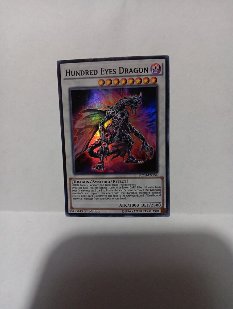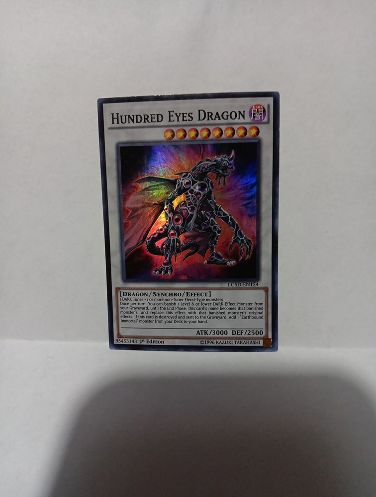 This card is a must-have for any Yu-Gi-Oh! TCG fan featuring Hundred Eyes Dragon, with a power of 3000 and a toughness of 2500, this Synchro card will surely enhance your collection. Part of the Legendary Collection 5D's set, this 1st Edition card is moderately played (Very good) and is ideal for any collector who values rarity and uniqueness. The Dragon type creature/monster adds to the aesthetics of the card. With the Attribute/MTG:Color of Dark, it's a perfect addition to any Dark-attribute deck. Remember to add this ungraded card to your collection before someone else snatches it up!