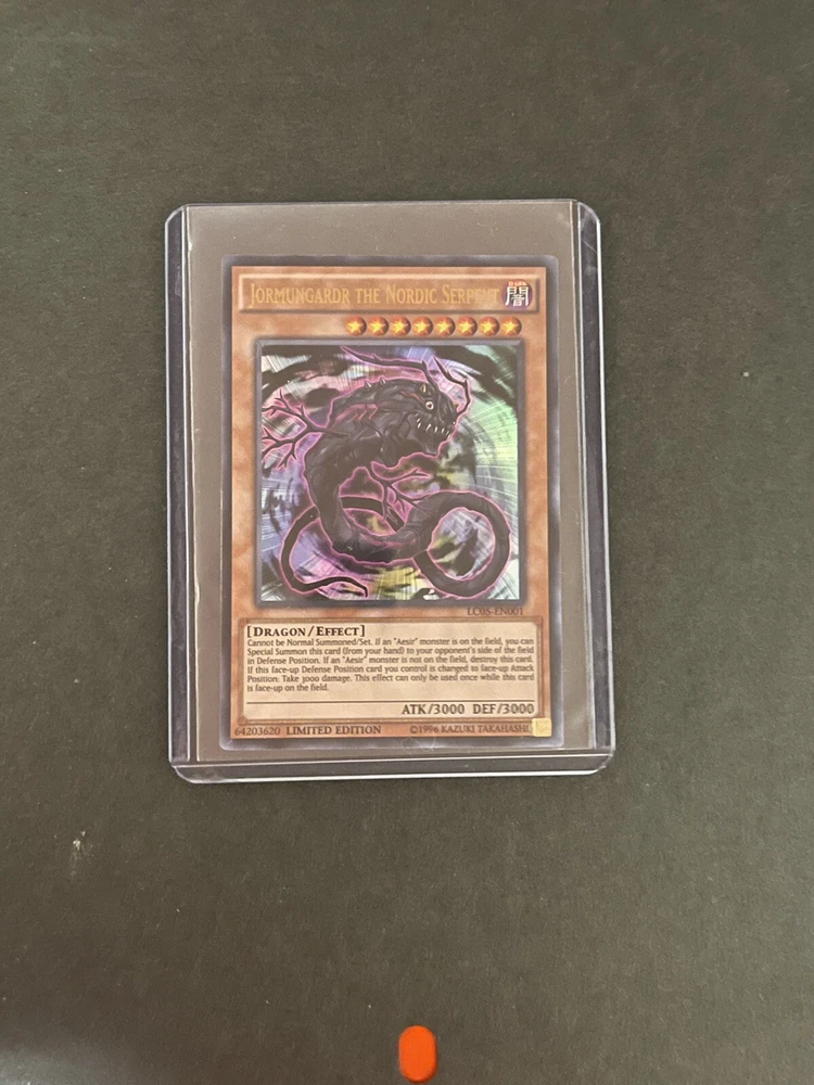For all you Yu-Gi-Oh! TCG collectors out there, check out this limited edition Jormungardr the Nordic Serpent card from the Legendary Collection 5D's set. This rare card has a power of 3000 and a defense of 3000, making it a formidable addition to any deck. Its dragon creature type and effect card type also make it a unique and valuable card to have in your collection. Don't miss out on the chance to add this special card to your Yu-Gi-Oh! TCG collection. Get your hands on this Jormungardr the Nordic Serpent card before it's gone! Shipped in soft sleeve and top loader.