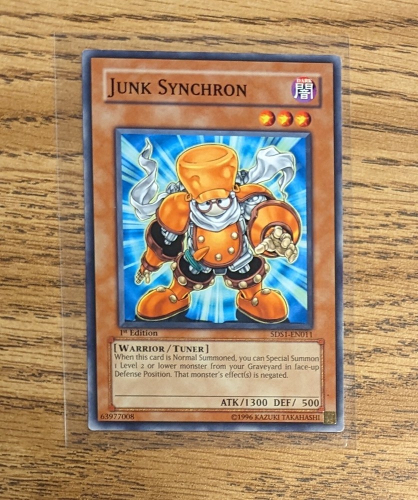 Buying multiple single cards will give you an automatic discount. Buy 2 Cards & Save 5% Buy 3 Cards & Save 8% Buy 5 Cards & Save 10% Buy 8 Cards & Save 15% Buy 10 Cards or more & Save 20% When buying 3 cards or more I will also automatically refund some of the shipping fees. This Yu-Gi-Oh! TCG card from the 5D's Starter Deck features the popular Junk Synchron monster. With a power of 1300 and a toughness of 500, this warrior type tuner card is perfect for any duelist's deck. The card has a common rarity and a regular finish, and is part of the Yu-Gi-Oh! 5D's set. The card is manufactured by Konami and has the card number 5ds1-En011. It comes from an unlimited edition Starter Deck and is in LP (lightly played) condition. This collectible card game item is a must-have for any fan of Yu-Gi-Oh! TCG.