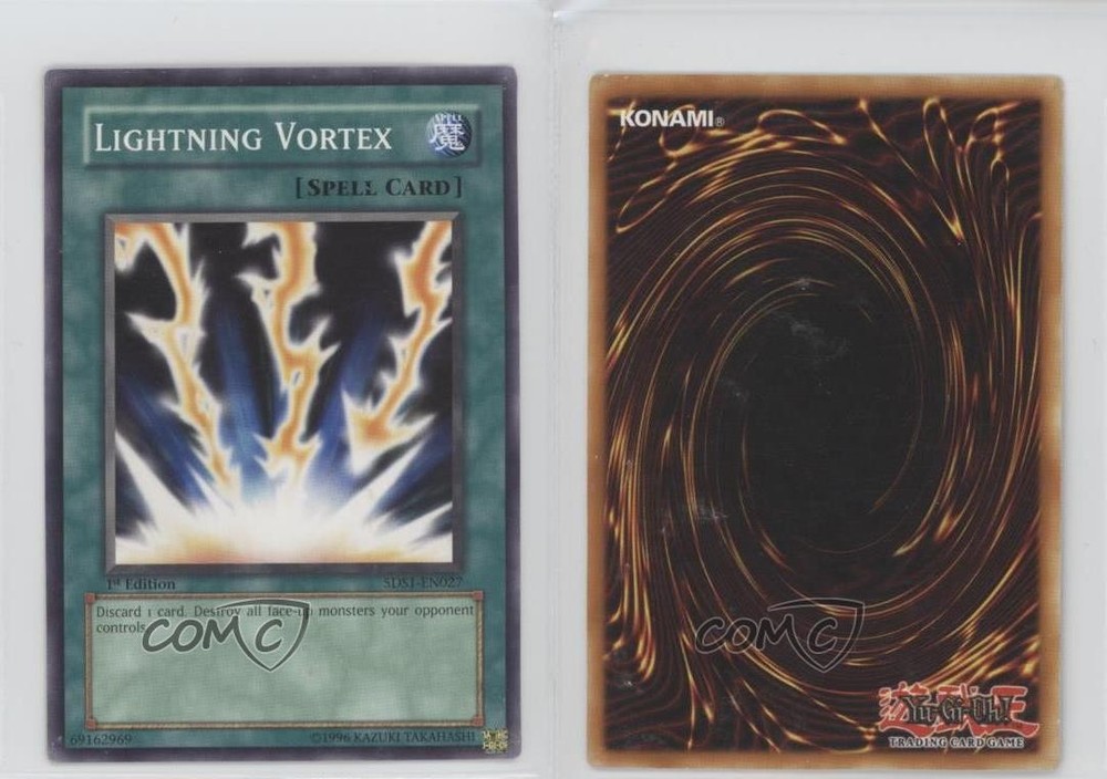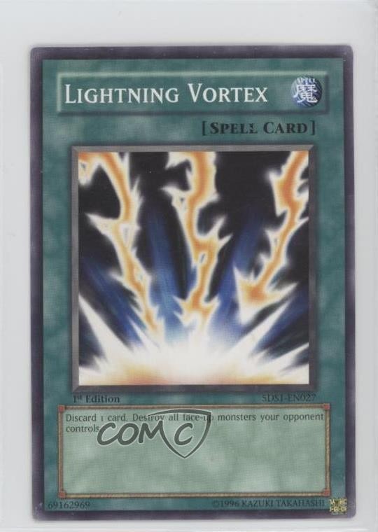 This is a Yu-Gi-Oh! Trading Card Game card named "Lightning Vortex" from the 5D's 2008 Starter Deck. It is a Common card with the card number 5DS1-EN027 and belongs to the Spell-Normal card type. The card is manufactured by Konami and is a 1st Edition in English language. It has 0 Attack/Power and 0 Defense/Toughness.