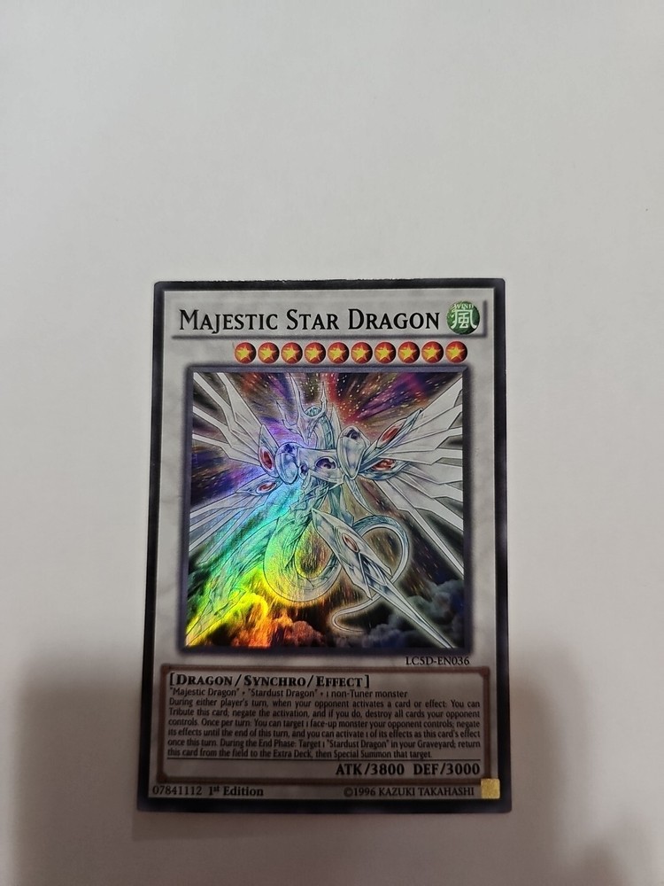This Yu-Gi-Oh! TCG card features the Majestic Star Dragon, a legendary creature with 3800 attack and 3000 defense. It is a synchro card with the card number LC5D-EN036, part of the 5D's Legendary Collection set. The card is wind colored and comes in 1st edition. This super rare card is a must-have for any Yu-Gi-Oh! TCG collector or player. With its stunning design and powerful features, it is sure to be a valuable addition to any collection. Don't miss the chance to own this amazing card!