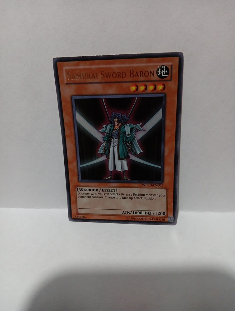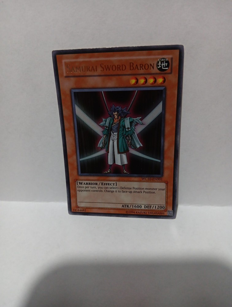 This Yu-Gi-Oh! TCG card features Samurai Sword Baron, a powerful Warrior monster with an Attack/Power of 1600 and Defense/Toughness of 1200. The card is part of the Yu-Gi-Oh! 5D's World Championship 2010: Reverse of Arcadia Promotional Cards set and is an Ultra Rare card with the card number Wc10-En001. The card has been lightly played (Excellent) and is in an ungraded condition type. It was manufactured in 2010 and is an Unlimited card with features that make it a great addition to any collector's set. This card's attributes include a color of Dark, a Creature/Monster Type of Warrior, and a Card Type of Effect.