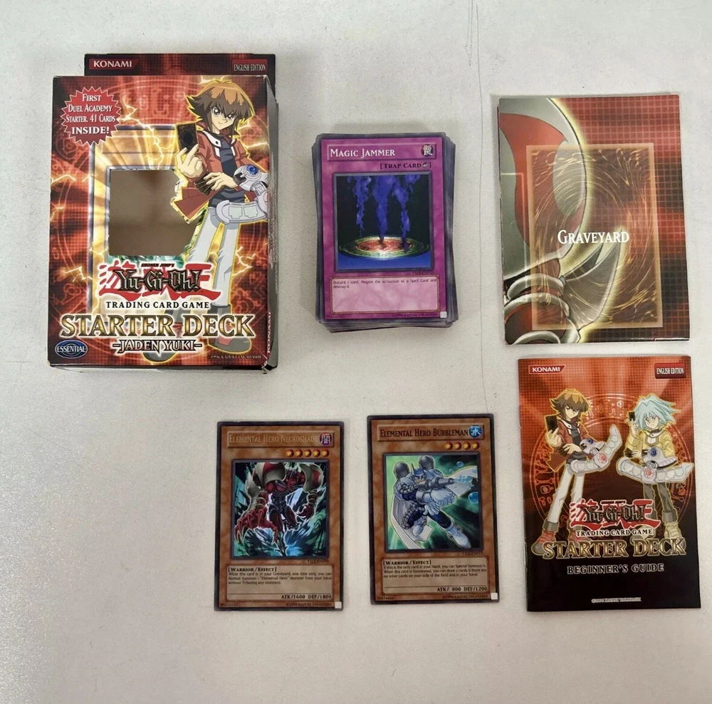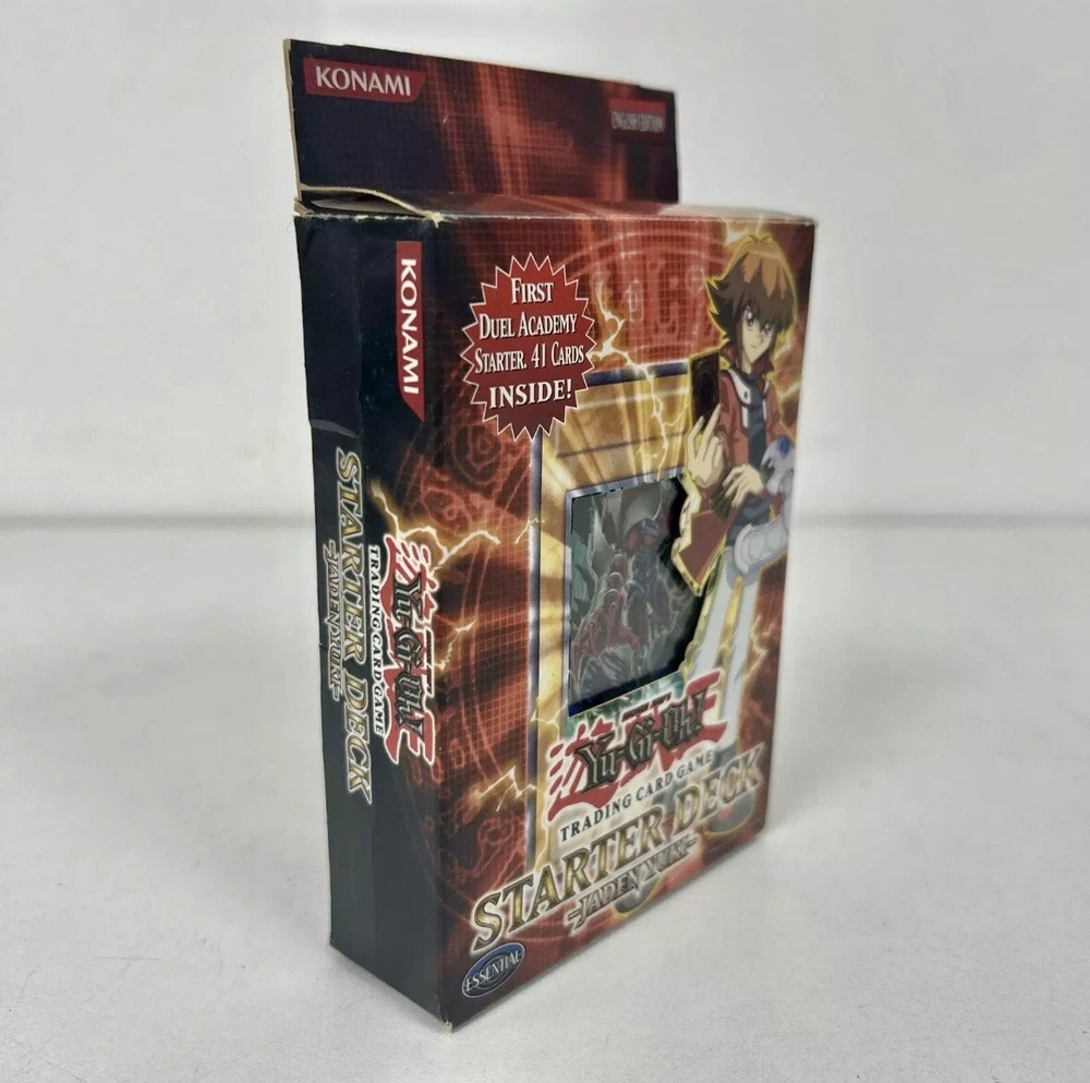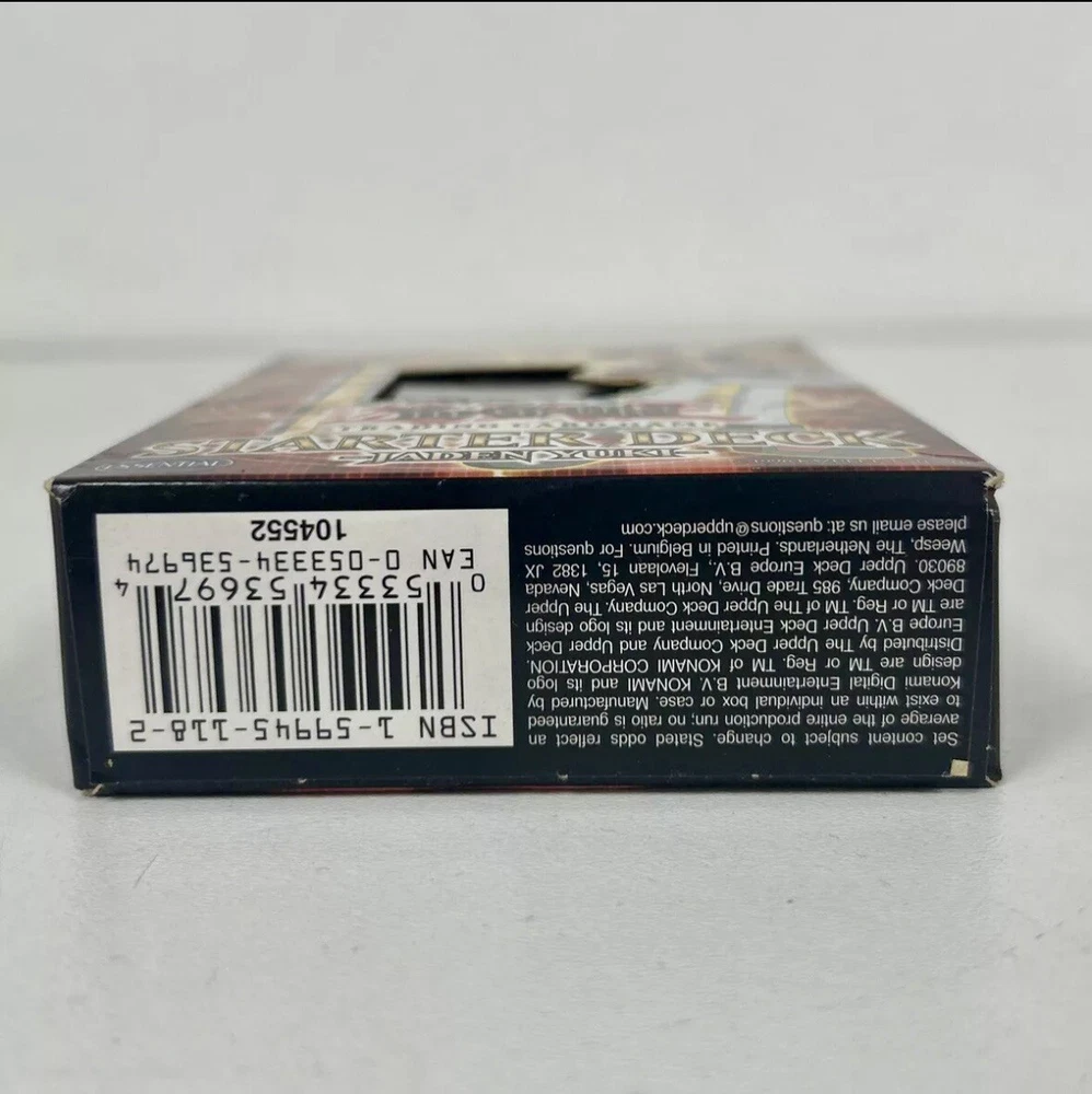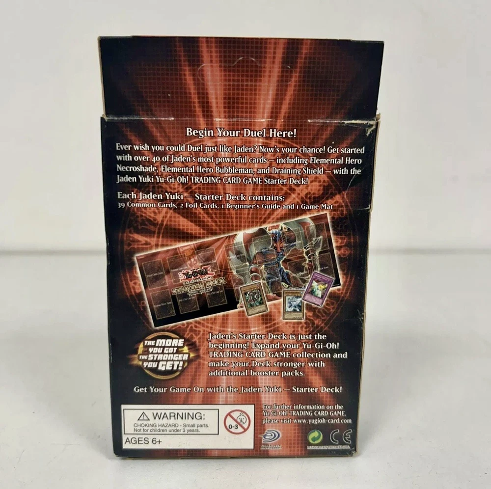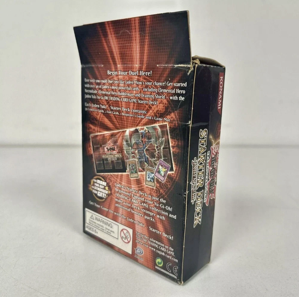 This is a Yu-Gi-Oh! Starter Deck featuring Jaden Yuki, with an unlimited edition LP open box. The deck includes 41 cards and is configured for optimal play. The archetype is Yu-Gi-Oh! GX and it was manufactured by Konami in 2007. The deck is in English and is suitable for ages 6 and up. The features of this deck include a starter deck and it is sold as a single deck or kit. This item is perfect for collectors and fans of the Yu-Gi-Oh! franchise. Includes Playmat and Rule Book.