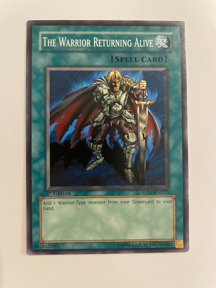 Yu-Gi-Oh! TCG The Warrior Returning Alive Yu-Gi-Oh! 5D's 5DS1-EN023 1st Edition Description About This Items This Yu-Gi-Oh! TCG card features the Spell-Normal type and is part of the Yu-Gi-Oh! 5D's set. The card number is 5DS1-EN023 and it is a Common rarity. The Warrior Returning Alive card is manufactured by Konami and is a must-have for any collector. This item is perfect for fans of the Yu-Gi-Oh! TCG game and those interested in collecting cards. Condition used Shipping We always send the item with a tracking number. So please place an order without any concern on delivery. You can always track the delivery status. Shipping is only available to the address registered in eBay. If you want us to send another address, please change your address on eBay and then place an order. Shipping is available from Monday to Friday. Weekends are not available because freight (shipping) companies are closed. We do not mark merchandise values below value or mark items as ?gifts? ? Japan, US and International government regulations prohibit such behavior. About Importer's Obligation Import duties, taxes, and charges are not included in the item price or shipping cost. These charges are the buyer's responsibility. Please check with your country's customs office to determine what these additional costs will be prior to bidding or buying. Thank you for your understanding.