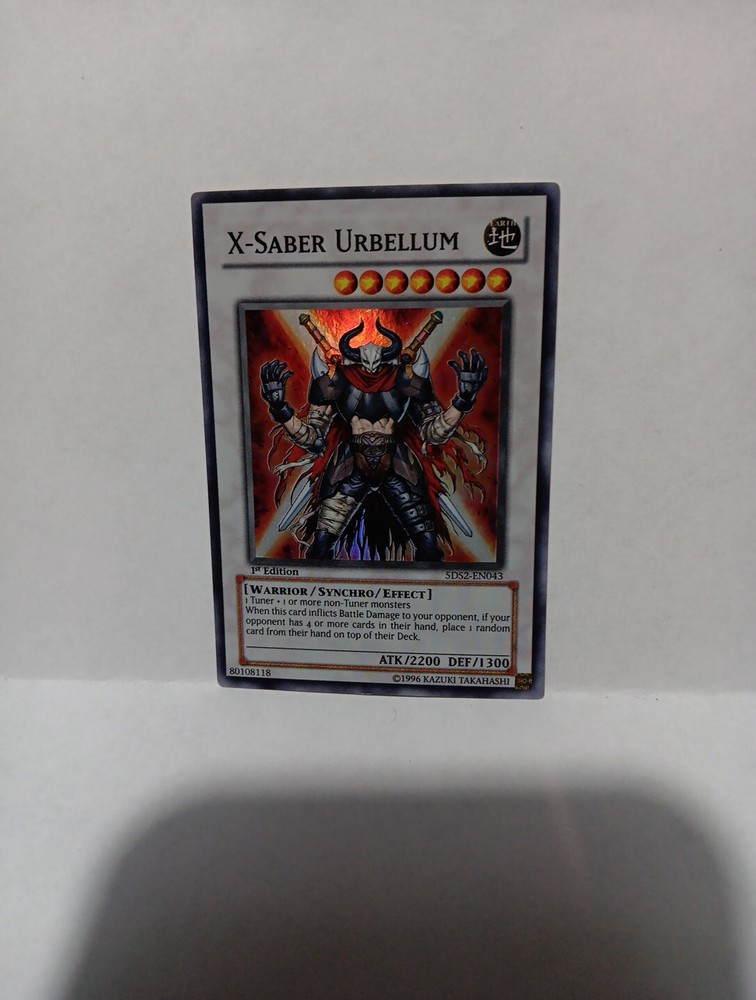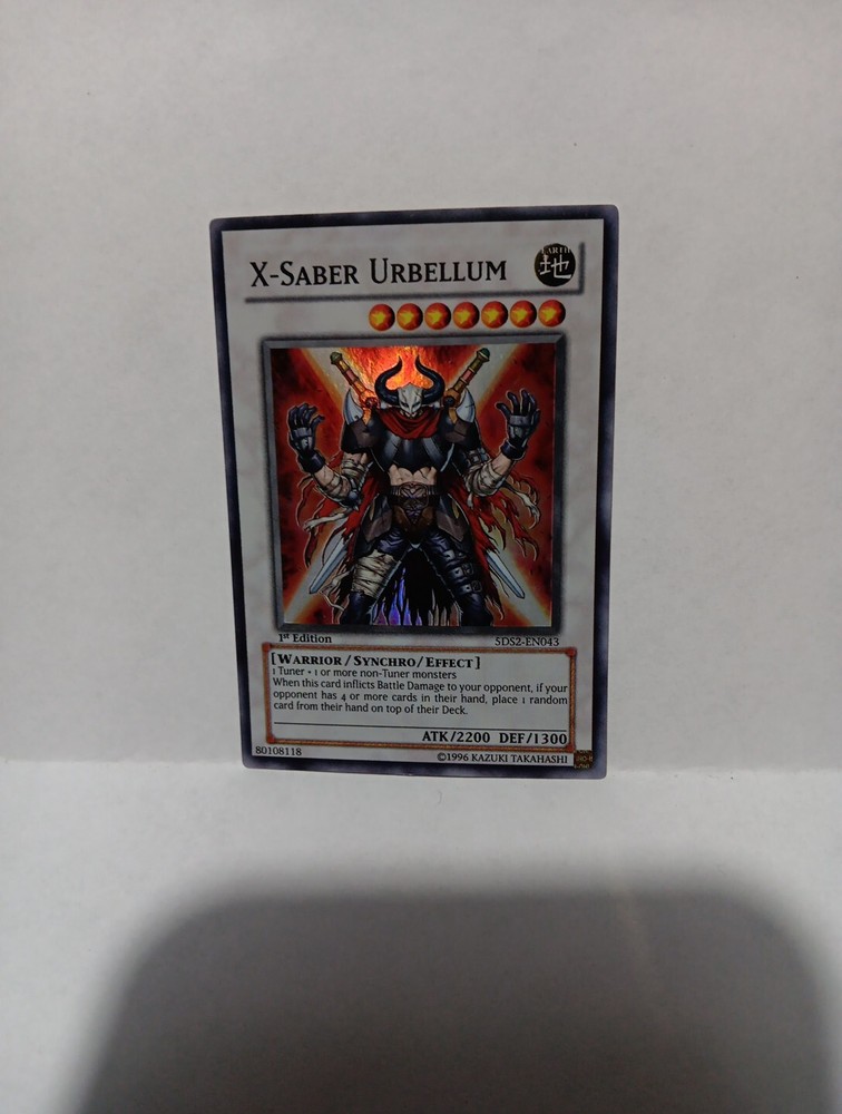 For sale is a Yu-Gi-Oh! TCG card, X-Saber Urbellum. This Super Rare card is from the Yu-Gi-Oh! 5D's set, with card number 5DS2-EN043 and a 1st Edition feature. Urbellum is a Synchro/Effect Monster with attributes of Earth and a Warrior Creature/Monster Type. The card has a Defense/Toughness of 1300 and an Attack/Power of 2200.