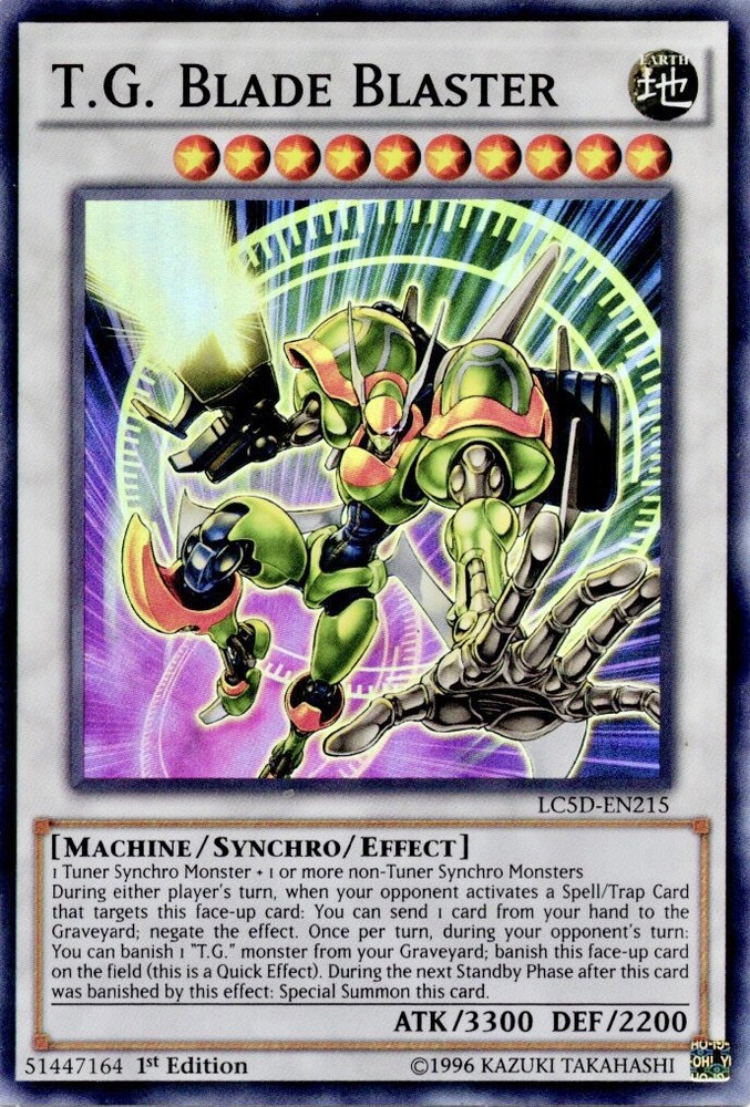 For sale is a highly sought-after Yu-Gi-Oh! TCG card, T.G. Blade Blaster. This card is a Super Rare 1st Edition LC5D-EN215 NM and is perfect for collectors and players alike. The card features the iconic character from the Yu-Gi-Oh! franchise and is in excellent condition. The card is manufactured by Konami and is in English language. It belongs to the Yu-Gi-Oh! Character Family and has a Rarity of Rare. This card is a must-have for any Yu-Gi-Oh! TCG fan and is sure to be a prized possession.