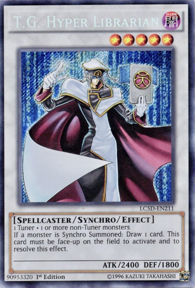 This Yu-Gi-Oh! card features the T.G. Hyper Librarian, a powerful Spellcaster with an Attack/Power of 2400 and a Defense/Toughness of 1800. It is a Synchro card with a Card Number of Lc5d-En211 and a Rarity of Secret Rare, making it a highly sought after addition to any collection. The card is in Near Mint condition and is part of the Legendary Collection 5D's set. It is a Japanese card with English language and a Holo finish, and was manufactured by Konami. The card is not considered vintage and features the 1st Edition stamp. This highly collectible card is a must-have for any Yu-Gi-Oh! TCG player or collector. It is perfect for use in a deck or for display purposes, and its unique attributes make it a valuable addition to any collection. Don't miss out on the opportunity to own this incredible T.G. Hyper Librarian card.