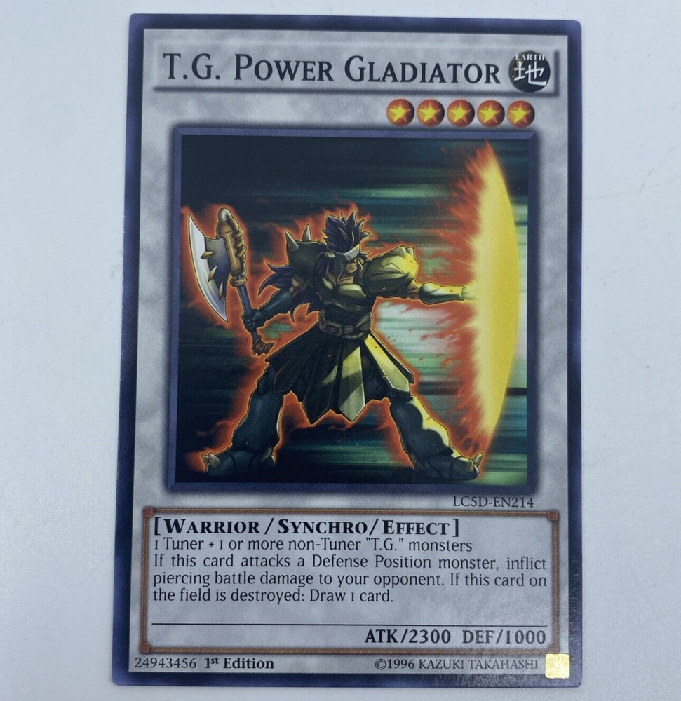 Yu-Gi-Oh! T.G. Power Gladiator [LC5D-EN214] Common 1st Edition LP Thank you for looking at our listing! We have been buying and selling on eBay for over 20 year, so you can rest assured you are buying from an experienced seller. We ship domestically and internationally through the eBay International Shipping Program and offer a hassle free return policy. Please refer to the pictures provided and/or any description in the listing for condition of this item. If you have any questions at all, please let us know!