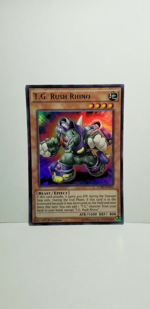 Yu-Gi-Oh T.G. Rush Rhino LC5D-EN210 Ultra Rare 1st Edition Near Mint. This card is near mint, placed in sleeve immediately, and not played. Card will be the same as the photo shown above. Card will be sleeved and in top loader to be shipped in bubble mailer. Shipped via USPS First Class Tracking number WILL be included. Thank you for reading the description!