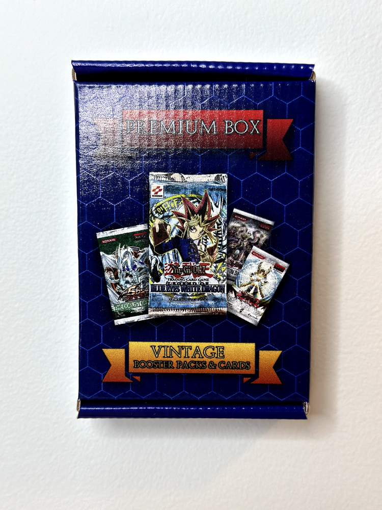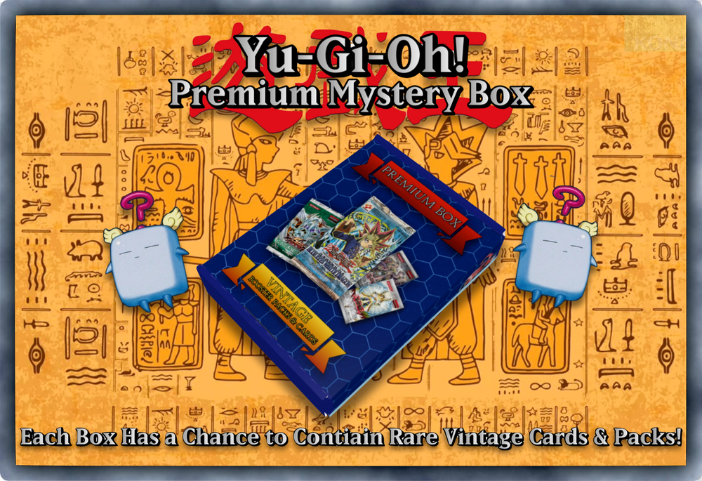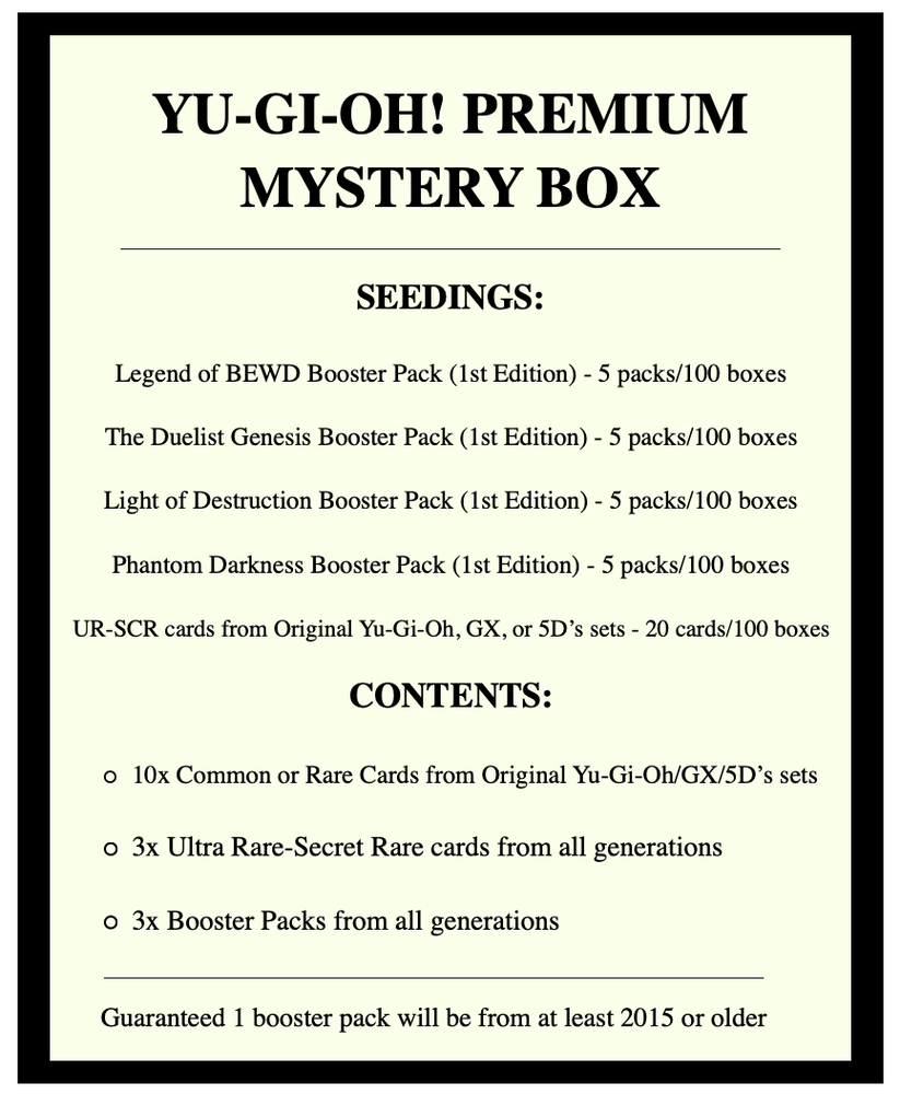 Each box will contain booster packs and cards from the popular Yu-Gi-Oh! Trading Card Game, possibly containing extremely rare Yu-Gi-Oh! products. Some of these rarer chase items consist of Legend of Blue-Eyes White Dragon, The Duelist Genesis, and other vintage 1st Edition booster packs. In addition, vintage holographic cards can be found, such as Exodia the Forbidden one (LOB-124), Dark Armed Dragon ( PTDN-EN019) , and many others. Check below for more about seedings of rare items. There are 100 boxes total, and all have been prepacked prior to listing to ensure authenticity and accurate seedings for rare items. Contents Each Premium Mystery Box is Guaranteed to contain the following: 10x Common/Rare Vintage Cards from original Yu-Gi-Oh, Yu-Gi-Oh GX, or Yugioh 5D's sets. 3x Ultra Rare or Rarer Holographic Cards from All Generations 3x Booster Packs from All Generations (at least one of the booster packs is guaranteed to be from 2015 or older) Seedings The odds of each mystery box containing a rarer item (out of 100 total boxes) Legend of Blue-Eyes White Dragon Booster Pack (1st Edition) -5 packs/100 boxes The Duelist Genesis Booster Pack (1st Edition) -5 packs/100 boxes Light of Destruction Booster Pack (1st Edition) -5 packs/100 boxes Phantom Darkness Booster Pack (1st Edition) -5 packs/100 boxes Ultra Rare-Secret Rare card from original Yu-Gi-Oh, Yu-Gi-Oh GX, or Yugioh 5D's sets - 20 cards/100 boxes The loose cards will range from Mildly-Played to Mint condition, and all booster packs are factory sealed. With 3 packs and 13 cards, each box will have 16 items total. Due to the randomized nature of this product, returns are not accepted as long as each box contains the guaranteed items outlined in the description/contents section above. This is a limited-time box. Once they sell out there won't be more just like them. Get a box while they last!