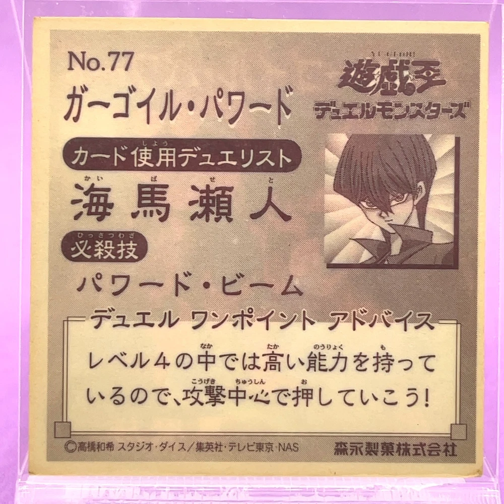 Yu-Gi-Oh! Wafer Sticker Gargoyle Power : Seto Kaiba No. 77 Jump Japan Yugioh Description Back Text Yu-Gi-Oh! Duel Monsters No. 77 Gargoyle Power Card User: Seto Kaiba Special Skill: Power Beam Duel One-Point Advice "Among Level 4 cards, it has high abilities, so focus on an attack-oriented strategy to push through!" © Kazuki Takahashi Studio Dice/Shueisha/TV Tokyo/NAS Ezaki Glico Co., Ltd. Payment Please pay within 5 days after purchase. Shipping I send a product by Japan Post or Fedex If your address is in a remote area due to shipping company regulations, please pay additional shipping charges via Paypal. Shipping is only available to the address registered in eBay. If you want us to send another address, please change your address on eBay and then place an order. Shipping is available from Monday to Friday. Weekends are not available because freight (shipping) companies are closed. We do not mark merchandise values below value or mark items as [gifts] Japan, US and International government regulations prohibit such behavior. Worldwide Shipping Economy shipping (Japan Post) : Air mail No tracking number - Asia : 5-14 days - USA : 7-14 days - Middle East, Europe, South America, North America, Africa :14-21 days Standard Shipping (Japan Post) : Air mail with tracking number - Asia : 5-14 days - USA : 7-14 days - Middle East, Europe, South America, North America, Africa :14-21 days Expedited shipping (Fedex) : With tracking number - Asia, Europe, North America: 1-2 days - USA, Middle East, Southern Europe, South America, Africa: 3-7 days (However, depending on the destination country, you may not be able to select Economy Shipping.) (Please note that these are estimated delivery times and actual delivery times may vary depending on the contents of the package, customs procedures, local handling conditions, etc.) Packaging We ensure your item is well-protected with robust and careful packaging. Cards, Stickers, Tickets, and Booklets: We place them between cardboard sheets and seal them in a bag to prevent bending and moisture damage. Even if you purchase multiple items, each will be individually sleeved. Mini-Figures: They are wrapped in bubble wrap, placed in a capsule, sealed in a bag, and further protected with thick cardboard. Large Figures and Other Items: We pack them carefully to ensure no direct pressure is applied to the item. Cancellations & Returns Cancellation or returns will be accepted only if the item has an obvious problem that was not mentioned in the listing description. If that, please let us know within 30 days you got the item. About Us We are located in Japan. If you have any questions or request about items, please feel free to ask us. We would be happy if you could add our products to your collection. About Importer's Obligation Import duties, taxes, and charges are not included in the item price or shipping cost. These charges are the buyer's responsibility. Please check with your country's customs office to determine what these additional costs will be prior to bidding or buying. Thank you for your understanding.