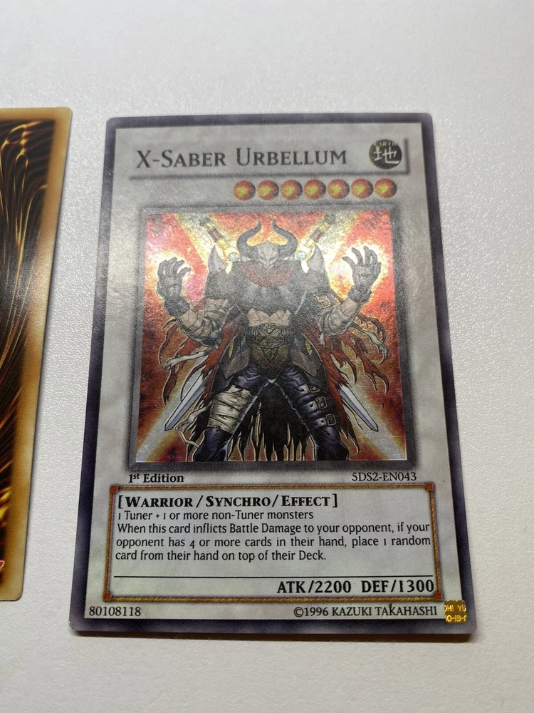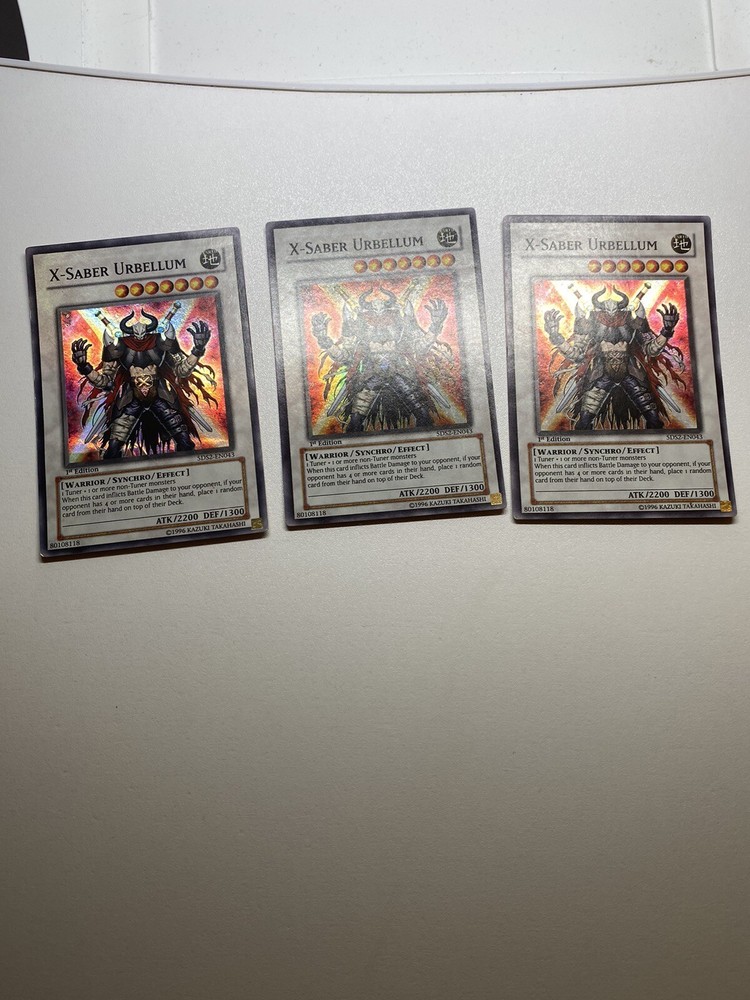 This listing is of 3 x-saber urbellum super rare 1st. The left one is heavily damaged with bends and creases. They are heavily played. Check pictures to see details on condition of the card. The front and back of the card are very dirty from gameplay. The front and the back are very scratched from gameplay. The four corners are very scratched up, bent and dented. The back has dents. “eBay International Shipping Program” and USA shipping only. No international shipping. I do combine/bundle shipping, so if it charges you high shipping price during adding to your cart (example: $20 or more), and it costs me (example: between $5 through $15), ill refund/discount the shipping discount difference. I do use recycled shipping items to stay eco friendly for our beautiful earth. Please leave positive feedback, and I will return positive feedback for better customer satisfaction, thanks.