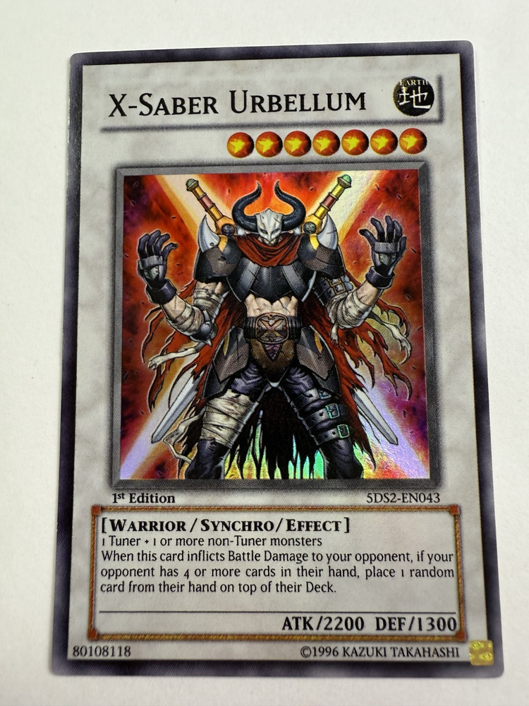 Dive into the strategic world of Yu-Gi-Oh! TCG with the X-Saber Urbellum card, a formidable addition to any deck. As a Super Rare 1st Edition from the 5D's 2009 set, this card boasts a unique Synchro type that can turn the tide of battle in your favor. Its distinctive artwork and powerful in-game abilities make it a sought-after piece for collectors and players alike. Enhance your collection with the X-Saber Urbellum, a card that embodies the excitement and intensity of the Yu-Gi-Oh! universe. With its rarity and edition ensuring its value, add this card to your arsenal and experience the synergy it creates within your deck.