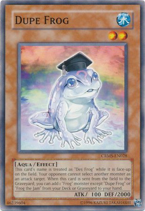 YuGiOh Yu-Gi-Oh 5D's Crimson Crisis Common Dupe Frog CRMS-EN028 Monster/Water/Aqua/2/100/2000. This card's name is treated as "Des Frog" while it is face-up on the field. Your opponent cannot select another monster as an attack target. When this card is sent from the field to the Graveyard, you can add 1 "Frog" monster except "Dupe Frog" or "Frog the Jam" from your Deck or Graveyard to your hand.