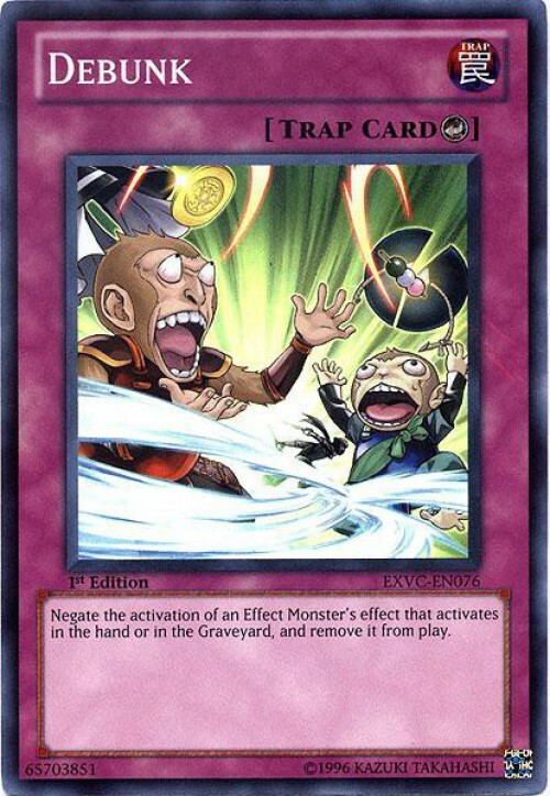 YuGiOh Yu-Gi-Oh 5D's Extreme Victory Super Rare Debunk EXVC-EN076 Counter. Negate the activation of the effect of an Effect Monster that activates in the hand or Graveyard, and remove it from play....