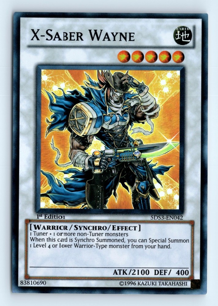 Cards 20$ or Less in Price Will be shipped in a penny sleeve and in a top loader by Ebay standard envelope. Please check out the scans for a good look at the condition. This is a example of a Starter Deck: Duelist Toolbox #5DS3-EN042 X-Saber Wayne .Other important information about this card: Super RareIn 0 X-Saber Wayne played for the .Please check out our other listings for more great cards.