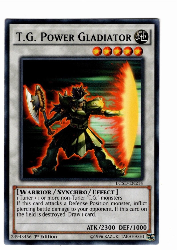 What's Included: Cds Card Name Rarity Edition Set Code Condition 1 T.G. Power Gladiator Common 1st Edition LC5D-EN214 Near Mint Additional Comments: All Pictures are scans of actual product(s) Near Mint Shipping/Feedback: **International Buyers** Total Shipping on all Combined orders will be $14.00 100% Positive & 5 Star Feedback 3 Years Running Orders Paid before 12:00 PM ET are shipped SAME DAY. Cards are shipped in penny sleeve(s) and toploader(s). Bubble Envelope and Tracking on Higher Cost Items. Card Grading: Grading cards is a subjective art form. I try to follow the TCGPlayer(Recently purchased by eBay) grading guide. Sometimes I will even put a grade like Very Light Play or Light to Moderate. The reason for that is because a card could be on the High or Low end of a Grade. Near Mint (NM) - Mostly clean card with very few flaws. Card should have clean corners with no wear but could have a tiny ding at a corner or edge. There could be some minor scuffing and scratches more so on the back. I am stricter regarding the front of the card. Keep in mind I even open fresh packs and get cards with scratches and corner dings. If you are a card collector message me if you have any questions. Especially for cards from older sets. Light Play (LP) - Cards will have some corner and/or edge wear. There could be a small bend but nothing major. There could also be some minor scuffing on the front. If I see more than a few dings, nicks and scratches I willl downgrade the card to Moderate Play. Moderate Play (MP) - Cards have a wide range of conditions. This could include cards that are very close to Light Play or close to Heavy Play. Expect some bends and/or a crease or two. I don't usually sell cards in this condition so it you want an exact grade please contact me. Heavy Play(HP) - What can I say. The card is a total wreck. Creases and heavy wear.