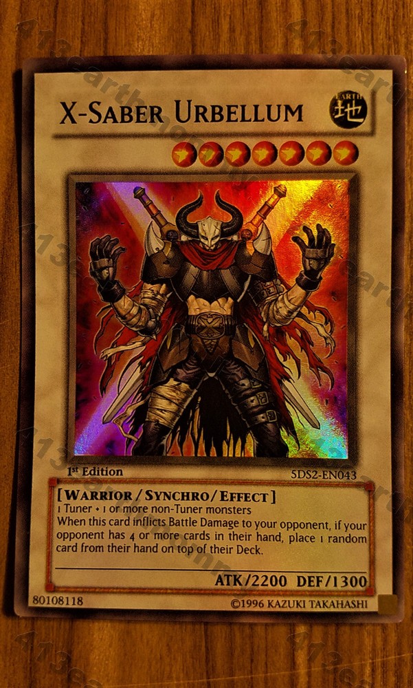 This is for a Yugioh 1st Ed holo 5DS2-EN043 "X-Saber Urbellum" NMint-Mint picture taken and securely packed for shipping.All cards are highly collectable, Each card will come with 2 randomly picked common cards (3 cards in total) thank you. Attention International buyers: Buyers need to be aware of the custom charges in their own country before even bidding/Buying on international items,We are not responsible for your countries customs tax duty and/or customs fees of any sort this includes your local postal services,The buyer is responsible for ALL fees,and if the buyer refuses to pay customs and returns the item,You will not be refunded shipping charges,Thank You. Accidental Purchase/ Buyers Remorse: Due to the complexity of the Buy It Now button and Because there are Rigorous steps for payment to be confirmed Accidental Purchase are no longer Acceptable. A buyer must request to cancel a transaction within 1 hour of purchasing item(s),We have 3 days to approve or decline this request. if request is declined all sales are a binding contract and buyers will have to honor the sale,Ebay will be notified as well. If we approve the cancellation request and the buyer has already paid for the item we will refund with in 10 days,Thank you. Attention buyers: All Items we have are kept in a windowless/ smoke-free building/House this mean that people who smoke cannot smoke inside or around the area.prior to items coming to us may indeed come from a smoker(s) unfortunately we are not responsible or have control over that,thank you. ?? ? TC World ? ?? Chargebacks and Payment Dispute: Due to an unexpected increase in chargebacks and payment disputes caused by dishonest and questionable buyers, we have decided to discontinue accepting inbox deals and making offers. We will exclusively be utilizing site coupons moving forward. Any inbox offers will be disregarded and deleted , and only serious inquiries will receive a response . Thank you.