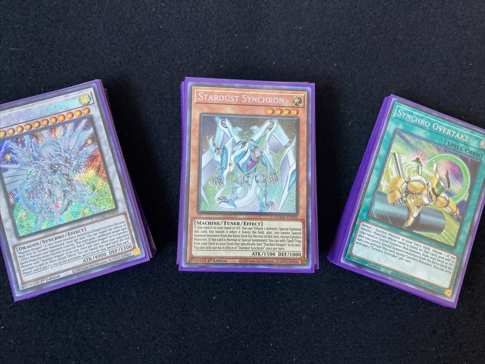 Hello!!! I am a Male Yugioh & Magic Collector & New Ebay Seller!!! I aim for 100% Customer Satisfaction so please!!! Message me about an item if you are not completely Satisfied with it. Below is the featured item if you have any questions please Message me!!! Happy Bidding!!! Picture may have been edited due to Inventory Changes Please read description Below Please Allow me the Set Handling time before your item will be shipped! It may take the full handling time set Thank You!!! Below is the featured item if you have any questions please MSG me!!! Happy Bidding!!! As a Bonus for buying my auction you will Recieve a Free Holo Card from my vast collection. It can be Super Rare, Ultra Rare, or Secret Rare or even GHOST Rare!!! You are bidding on: 40 CARD YUSEI FUDO SYNCHRON DECK: Extra Deck Cards (15): 1x Shooting Majestic Star Dragon (Secret Rare) 1x Hot Red Dragon Archfiend King Calamity (Ultra Rare) 1x Stardust Sifr Divine Dragon (Ultra Rare) 1x Trishula, Dragon of the Ice Barrier (Ultra Rare) 1x Scarlight Red Dragon Archfiend (Ultra Rare) 1x Junk Speeder (Secret Rare) 1x Stardust Dragon (Rare) 1x Cosmic Blazar Dragon 1x Herald of the Arc Light (Ultra Gold Rare) 1x Martial Metal Marcher (Ultra Rare) 1x Celestial Double Star Shaman (Ultra Rare) 1x Crystron Ametrix (Super Rare) 1x T.G. Hyper Librarian (Super Rare) 1x Formula Synchron 1x Accel Synchron Monster Cards (24): 1x Stardust Synchron (Secret Rare) 1x Junk Converter (Super Rare) 1x Steam Synchron (Ultra Rare) 1x Cyberse Synchron (Rare) 1x Unknown Synchron 3x Junk Synchron 3x Caligo Claw Crow 3x Doppelwarrior 1x Boost Warrior (Ultra Rare) 3x Synchron Carrier (Rare) 1x Omni Dragon Brotaur (Ultra Rare) 1x White Dragon Wyverburster 1x Black Dragon Collapserpent 1x Stardust Xiaolong (Rare) 1x Converging Wills Dragon 1x Stardust Trail Spell Cards (13): 1x Syncho Overtake (Secret Rare) 1x Arrive in Light (Secret Rare) 1x Stardust Illumintion (Ultra Rare) 3x Starlight Junktion (Rare) 3x Tuning 1x Reinforcement of the Army 1x Pot of Avarice 1x Foolish Burial 1x Mind Control Trap Cards (3): 3x Fuhma Wave